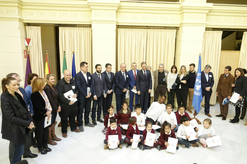 El alcalde de Málaga, Francisco de la Torre, asiste a la presentación del estudio ‘Análisis del perfil e impacto económico de los visitantes a la Semana Santa de 2016’, junto a Antonio Banderas y los representantes de la Fundación Lágrimas y Favores, la Cátedra de Estudios Cofrades de la Universidad de Málaga y la Obra Social la Caixa