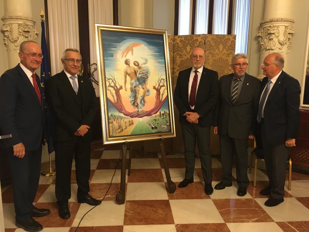 El alcalde de Málaga, Francisco de la Torre, acompañado de miembros de la Corporación Municipal, del hermano mayor de la Congregación, Antonio Ortega, y del Pregonero, Manuel Molina Gálvez, participa en el acto de presentación del cartel de las fiesta patronales en honor de San Ciriaco y Santa Paula, obra del pintor Ángel Calle Matas.