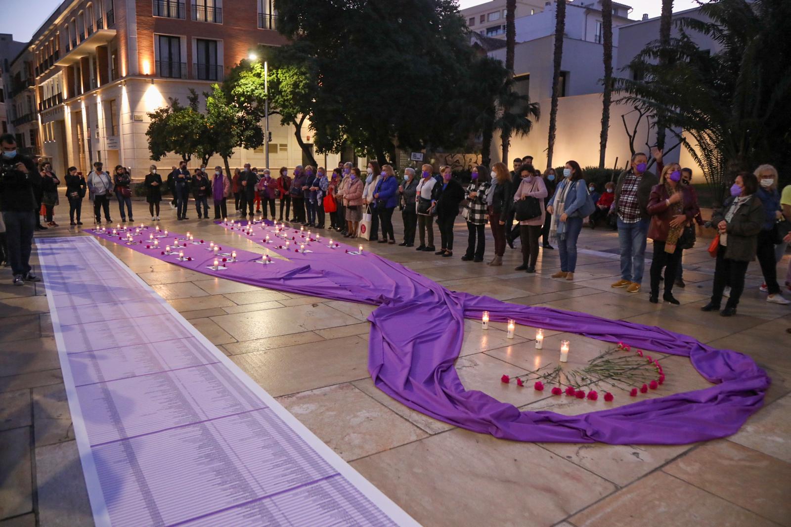 Acto interinstitucional a iniciativa del Consejo Sectorial de las Mujeres en la calle Alcazabilla con motivo de la conmemoración de 25N, Día Internacional de la Eliminación de la Violencia contra la Mujer. Se ha confeccionado un lazo morado en memoria de las víctimas de la violencia de género, en el que se han colocado los nombres de las mujeres y menores asesinados, junto con una vela y una flor. También se han repartido lazos morados a las personas asistentes al acto.