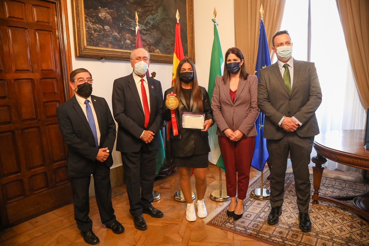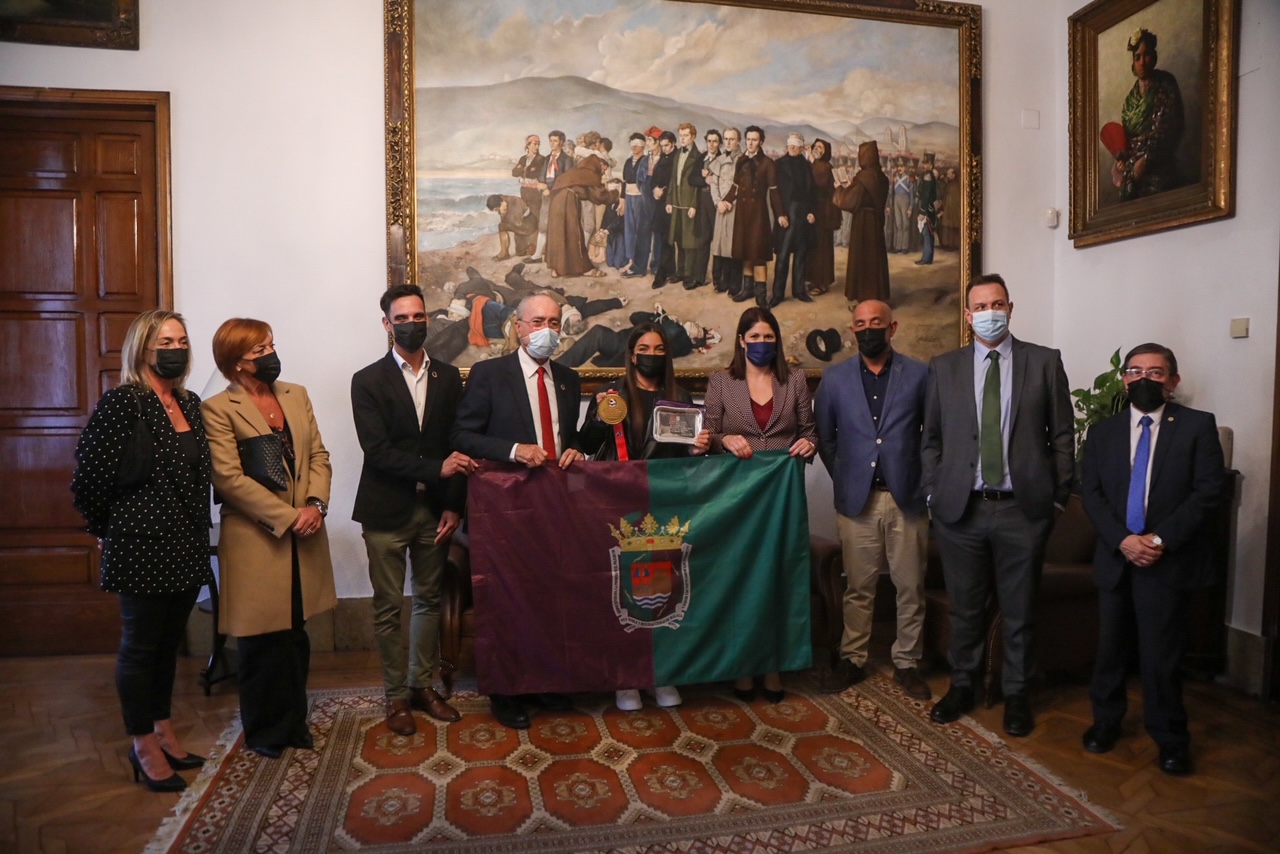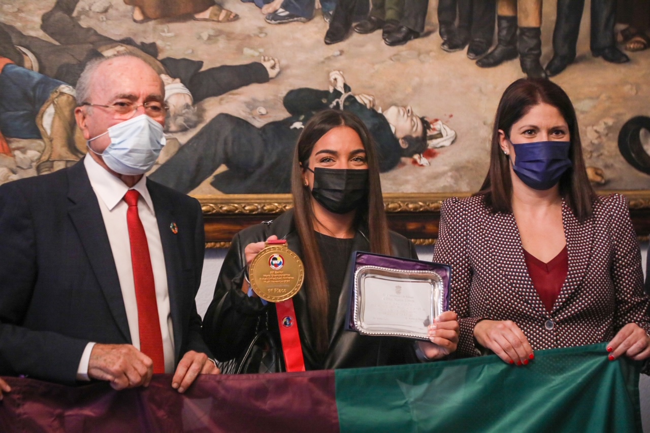 El alcalde de Málaga, Francisco de la Torre, ha recibido, junto a la concejala delegada de Deporte, Noelia Losada, a la karateca María Torres con motivo de su medalla de oro en el Campeonato del Mundo Absoluto celebrado en Dubai.