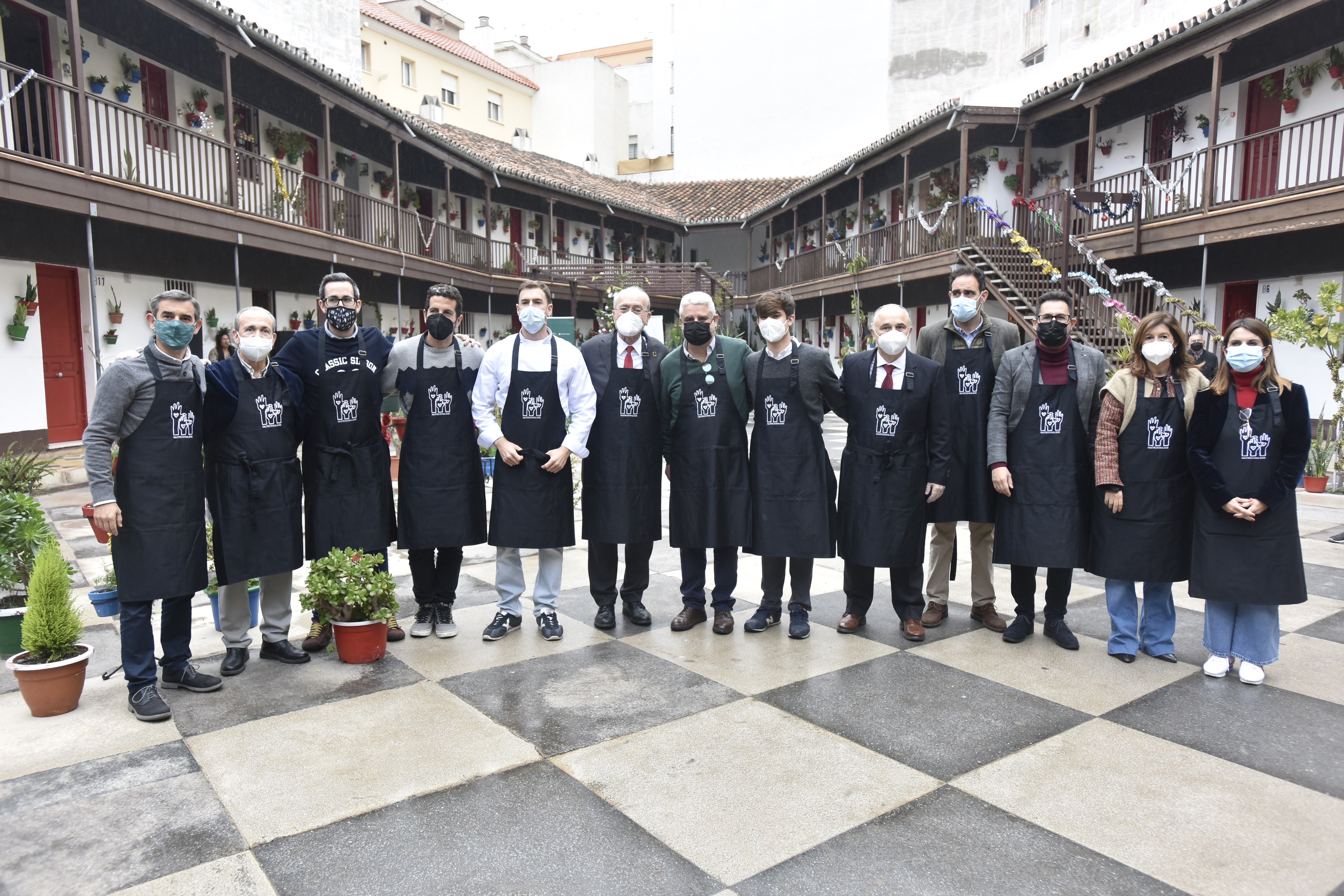 El alcalde de Málaga, Francisco de la Torre, acompañado de los concejales de Derechos Sociales, Innovación y Digitalización Urbana y Distrito Centro, Francisco Pomares, Susana Carillo y Gemma del Corral, respectivamente, del director territorial de CaixaBank en Andalucía Oriental, Juan Ignacio Zafra, del director de Lumen Proyectos Gastronómicos, Álvaro Muñoz, del presidente de Mahos (Asociación de Hosteleros de Málaga), Javier Frutos; de los chefs ejecutivos Pablo Miguel Molina de Matiz y Pedro Hervás de Carmen-Hotel Only You Málaga y de Ángel Sánchez del restaurante El Chinitas y Antonio Cárdenas, fundador de La Canasta, ha asistido a la entrega de los menús solidarios a los vecinos del corralón de Santa Sofía en la barriada de la Trinidad.