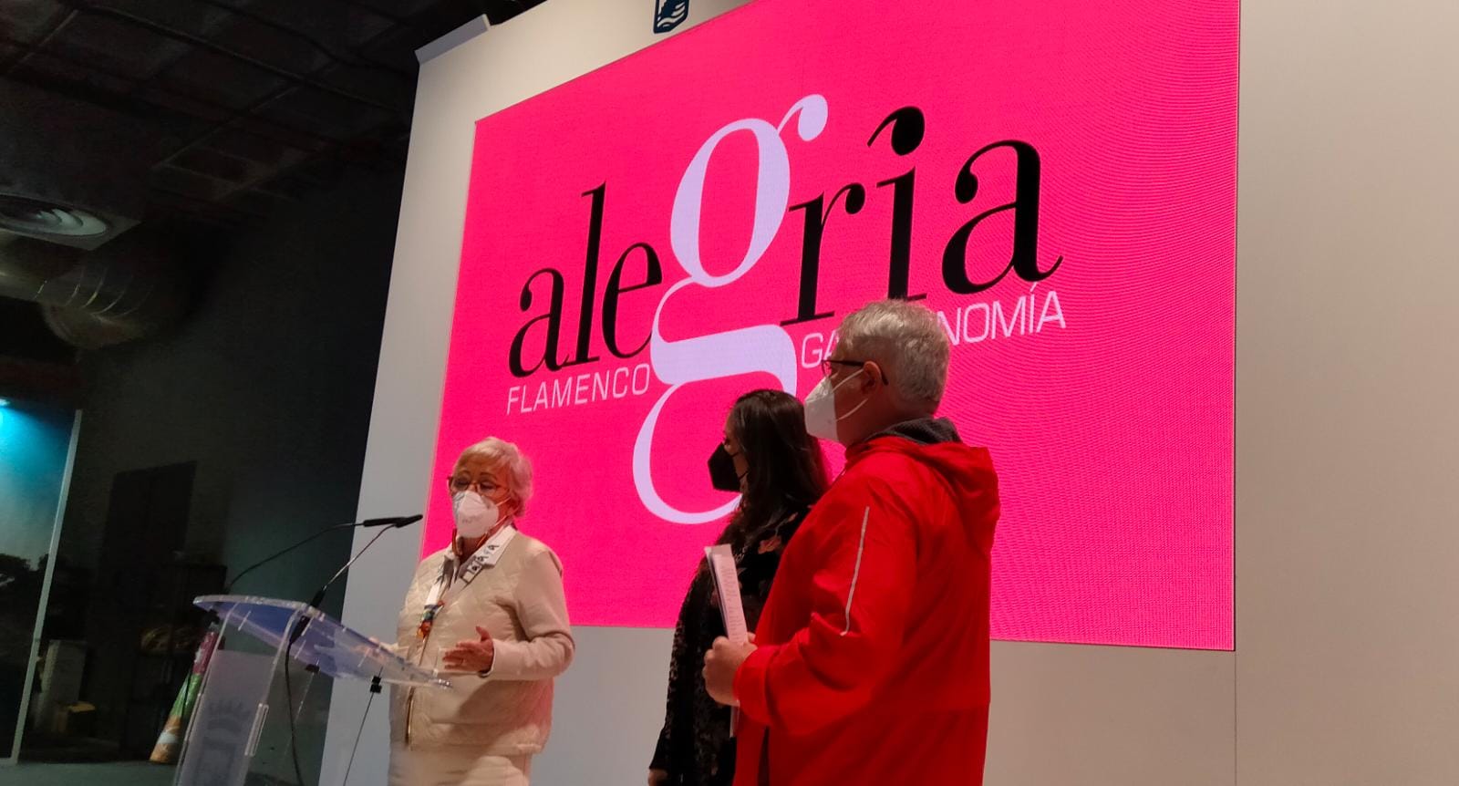 La concejala de Fiestas, Servicios Operativos y Playas, Teresa Porras acompaña, en el stand "Málaga, Ciudad Genial" en el marco de Fitur 2022, a los impulsores del proyecto del Centro Interactivo de Flamenco "Alegría" Marina Arana y José Luis López, durante el acto de presentación del mismo. Este centro está ubicado el barrio de La Malagueta se ha concebido como un nuevo espacio didáctico de conocimiento del flamenco desde la experiencia emocional y sensitiva.
