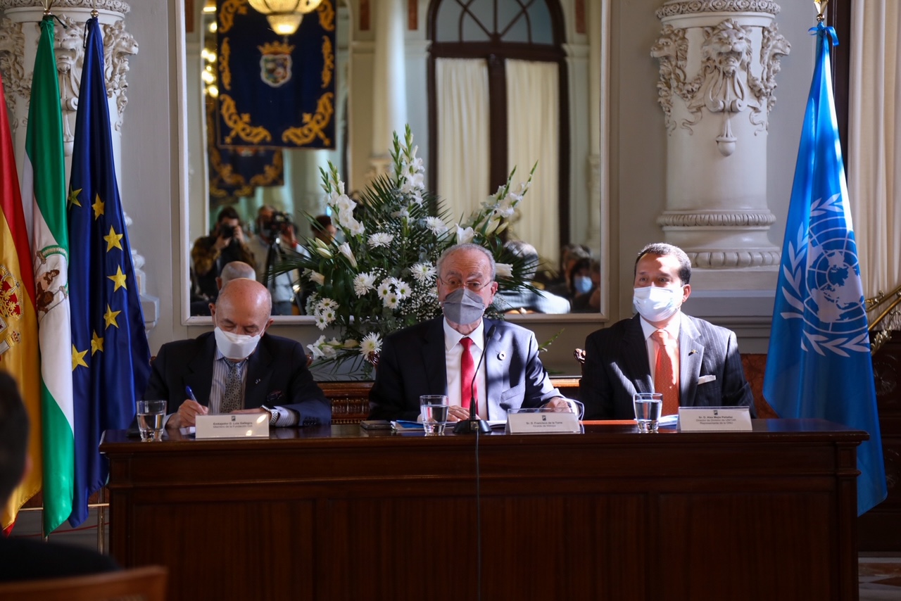 El alcalde de Málaga, Francisco de la Torre, ha asistido a la presentación por parte del director de UNITAR, Álex Mejía, y del embajador Luis Gallegos, representante de la Iniciativa Global de Envejecimiento, de la Fundación ‘Global Initiative on Ageing’ (Fundación GIA) que tiene por objetivo sensibilizar sobre los retos y oportunidades que el envejecimiento de la población aporta a la sociedad.