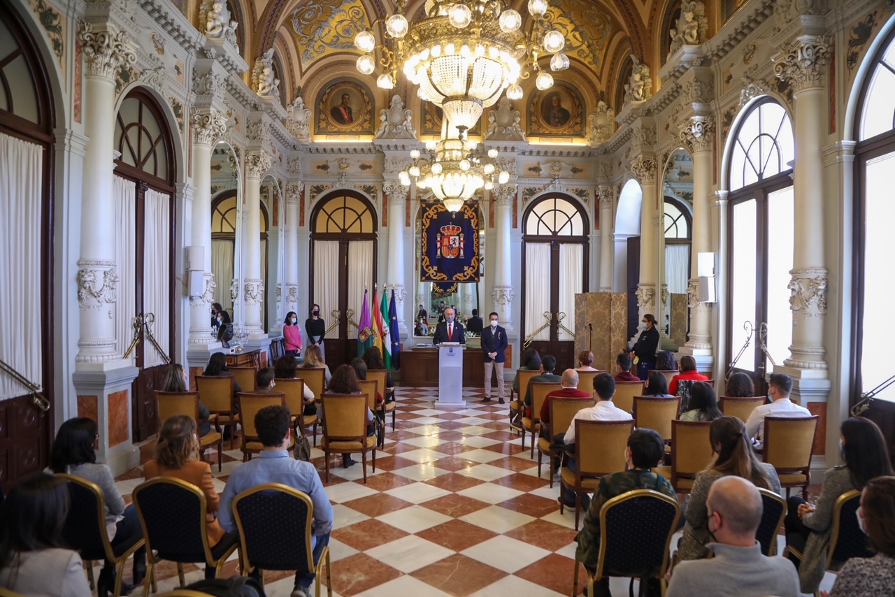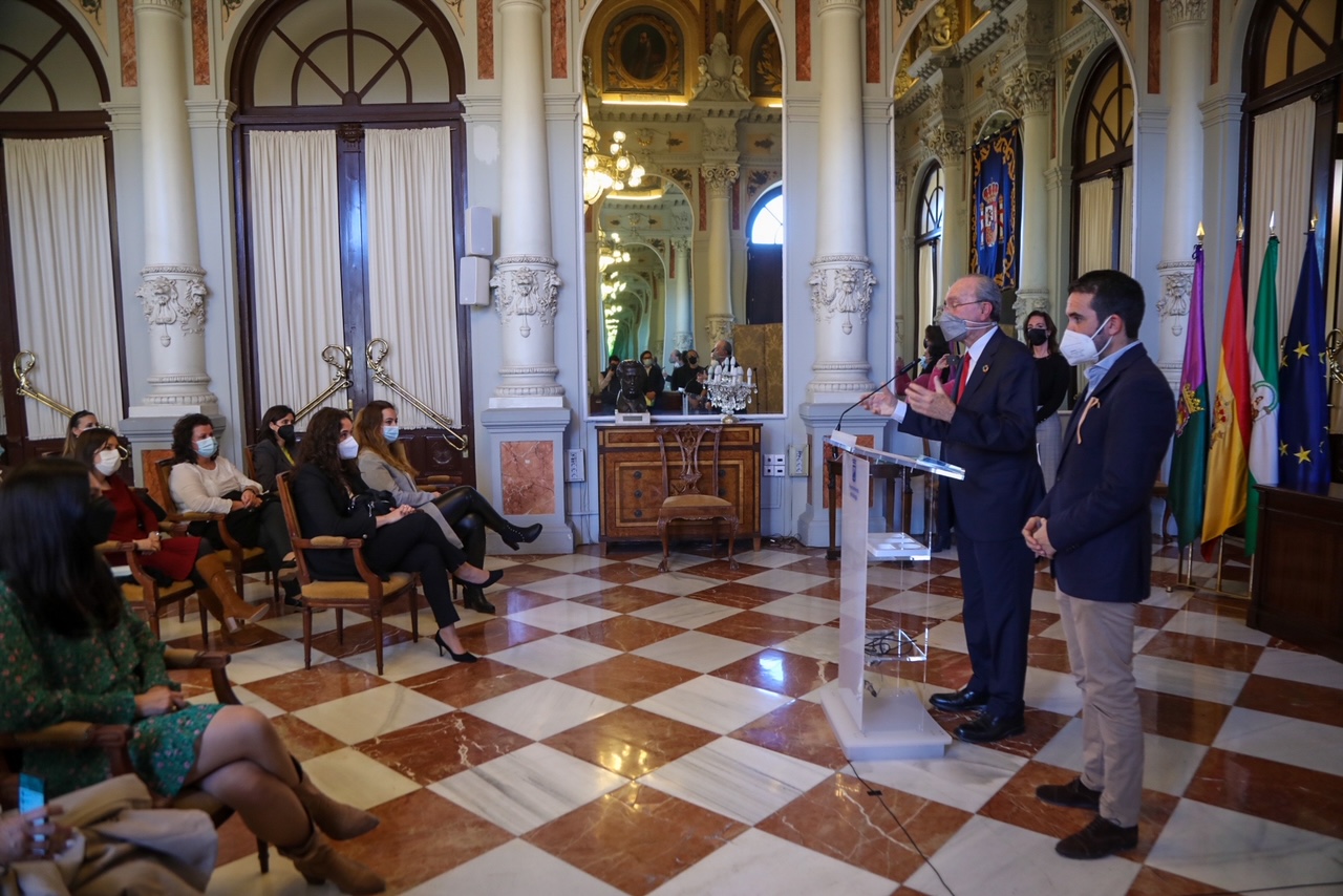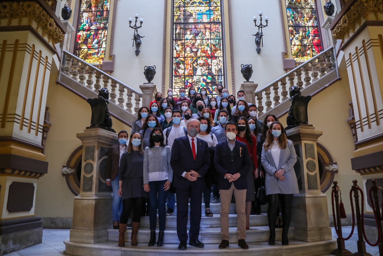 El alcalde de Málaga, Francisco de la Torre, acompañado por el concejal de Recursos Humanos y Calidad, Jacobo Florido, ha recibido hoy a los funcionarios de carrera que han tomado posesión de sus plazas en la categoría de administrativo de administración general (15 plazas) y en la categoría de auxiliar de administración general (31 plazas), tras haber superado las pruebas correspondientes a las recientes convocatorias, por oposición, desarrolladas por el Consistorio malagueño.