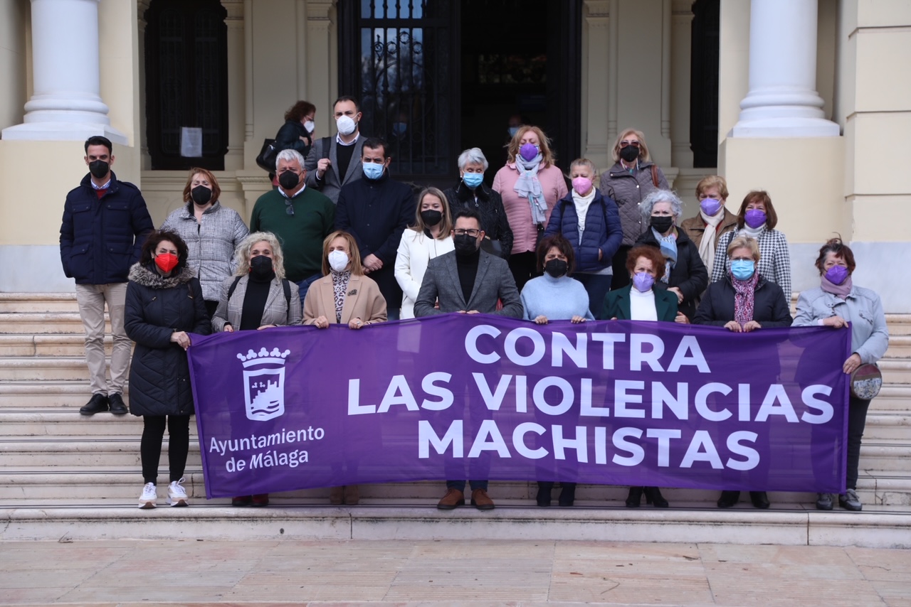 Miembros de la Corporación Municipal han mantenido esta mañana un minuto de silencio en memoria de la última víctima de la violencia de género confirmada, mujer asesinada en Madrid el 2 de marzo. El acto ha tenido lugar hoy viernes 4 de marzo, en las escaleras exteriores del edificio del Ayuntamiento de Málaga.