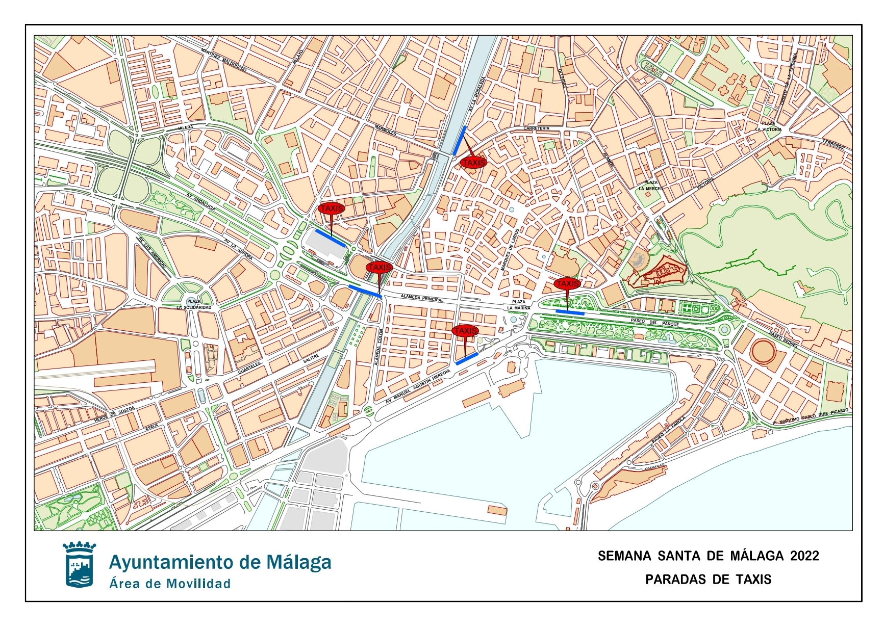 Además de las paradas habituales, durante todos los días de la Semana Santa se habilitarán las siguientes pareadas de taxis provisionales, que estarán operativas en función de los requerimientos de los desfiles procesionales: