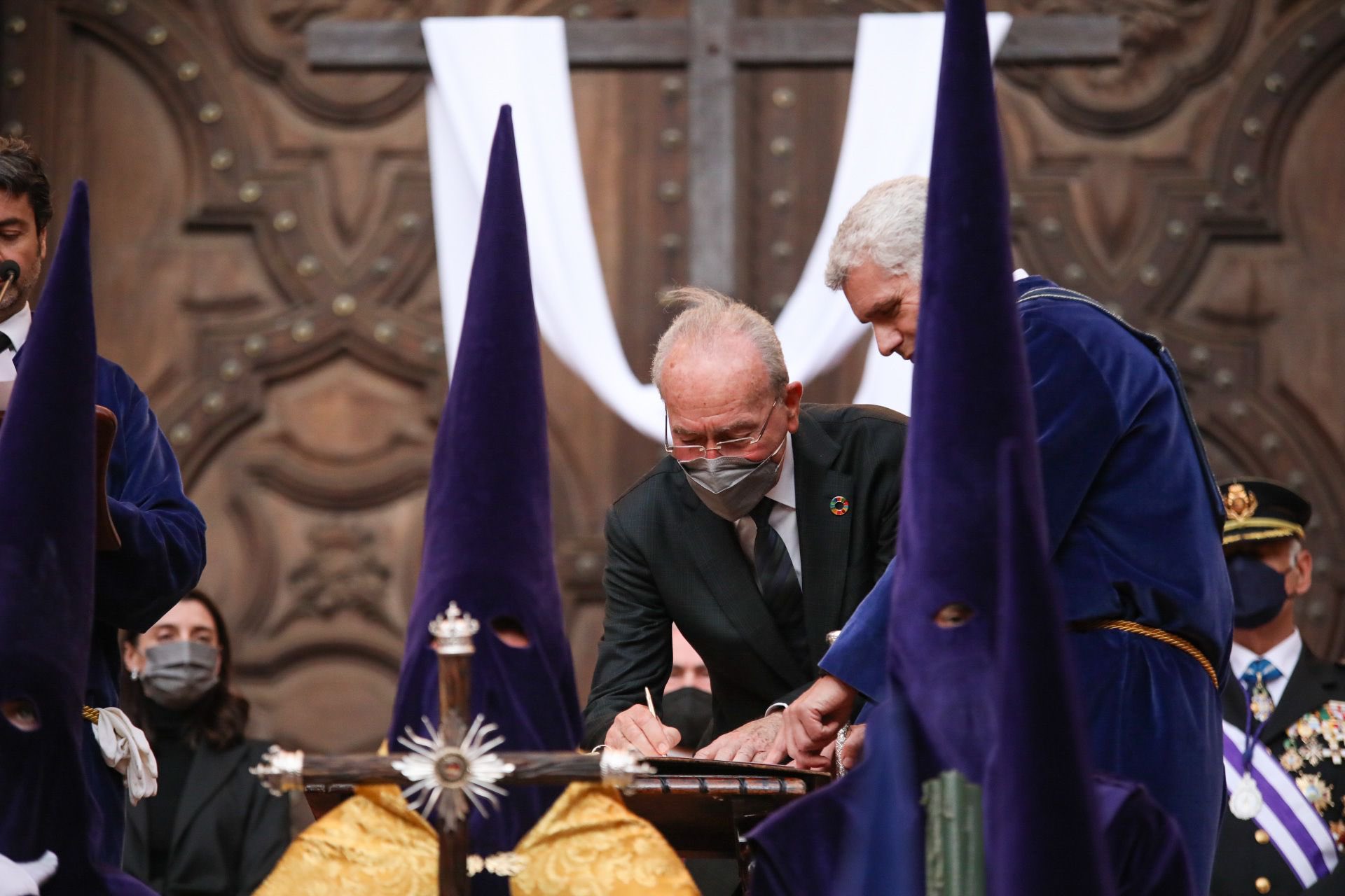 El alcalde de Málaga, Francisco de la Torre, ha firmado el acta de liberación por parte de la cofradía de Nuestro Padre Jesús el Rico del preso J.C., en el tradicional acto celebrado esta tarde en la plaza del Obispo con la presencia de la ministra de de Justicia del Gobierno de España, Pilar Llop, y el obispo de la diócesis de Málaga, Jesús Catalá.