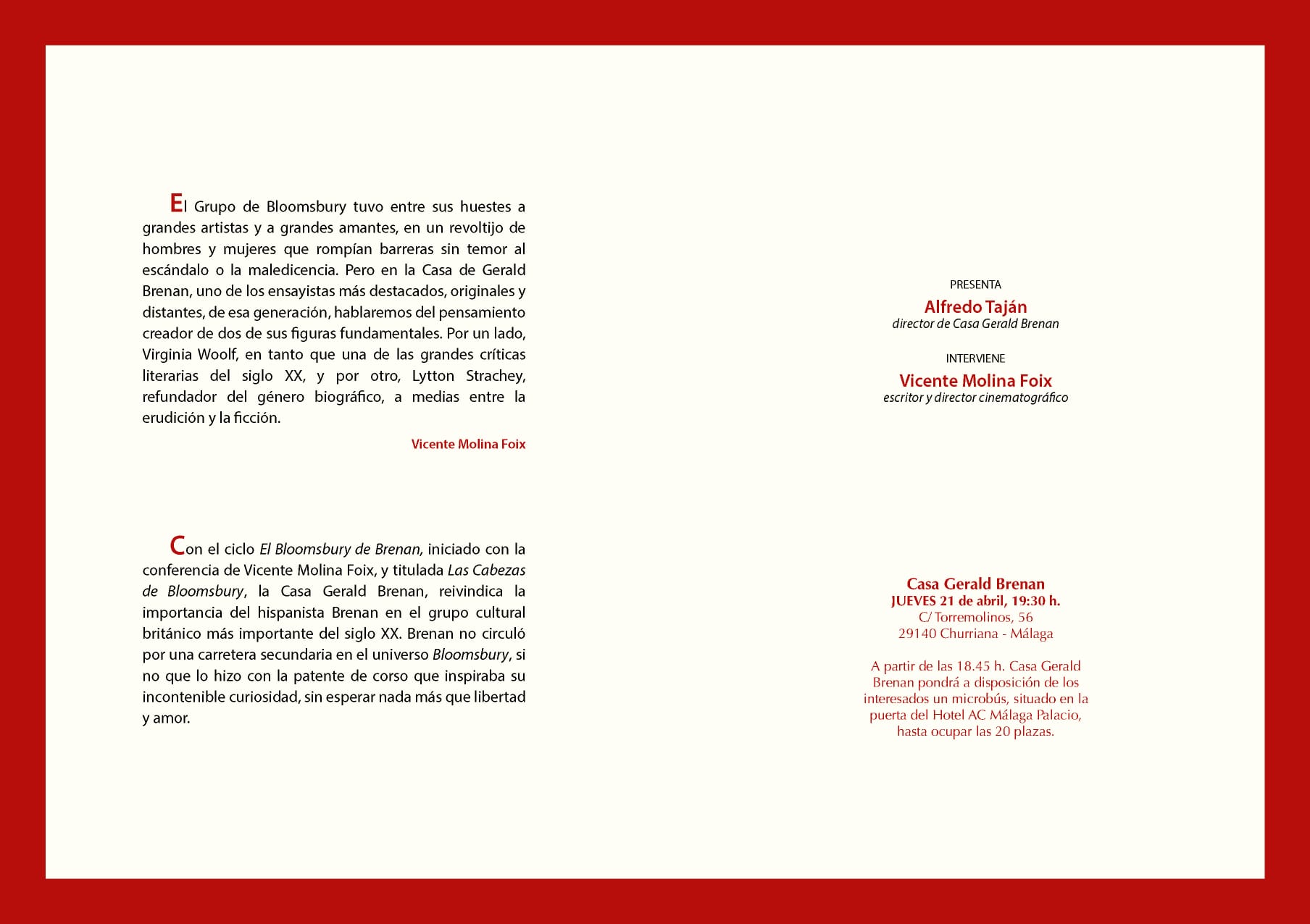 LA CASA DEL HISPANISTA EN CHURRIANA RECIBE A VICENTE MOLINA FOIX PARA INAUGURAR EL CICLO ‘EL BLOOMSBURY DE BRENAN’ 19/4/2022 Imagen En este ciclo participarán también Javier Martín Domínguez y Nuria Barrios Documentos NOTA INFORMATIVA.pdf 163,46 KB kb Galería de imágenes