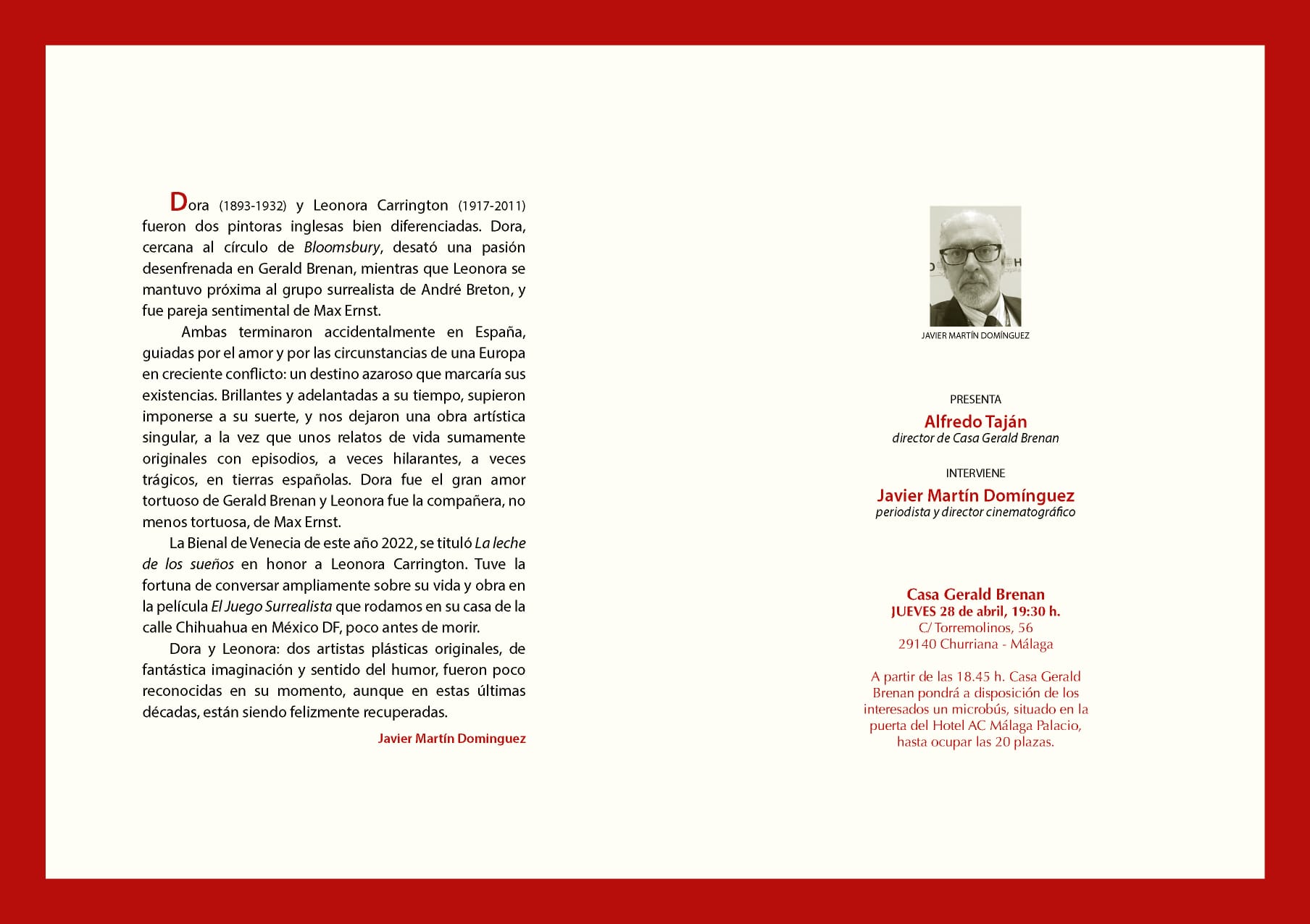 LAS FIGURAS DE DORA Y LEONORA CARRINGTON CENTRAN LA INTERVENCIÓN DE JAVIER MARTÍN-DOMÍNGUEZ EN EL CICLO ‘EL BLOOMSBURY DE BRENAN’ 25/4/2022 Imagen Será en la Casa Gerald Brenan de Churriana, el jueves 28, a las 19:30 horas Documentos NOTA INFORMATIVA.pdf 164,66 KB kb Galería de imágenes