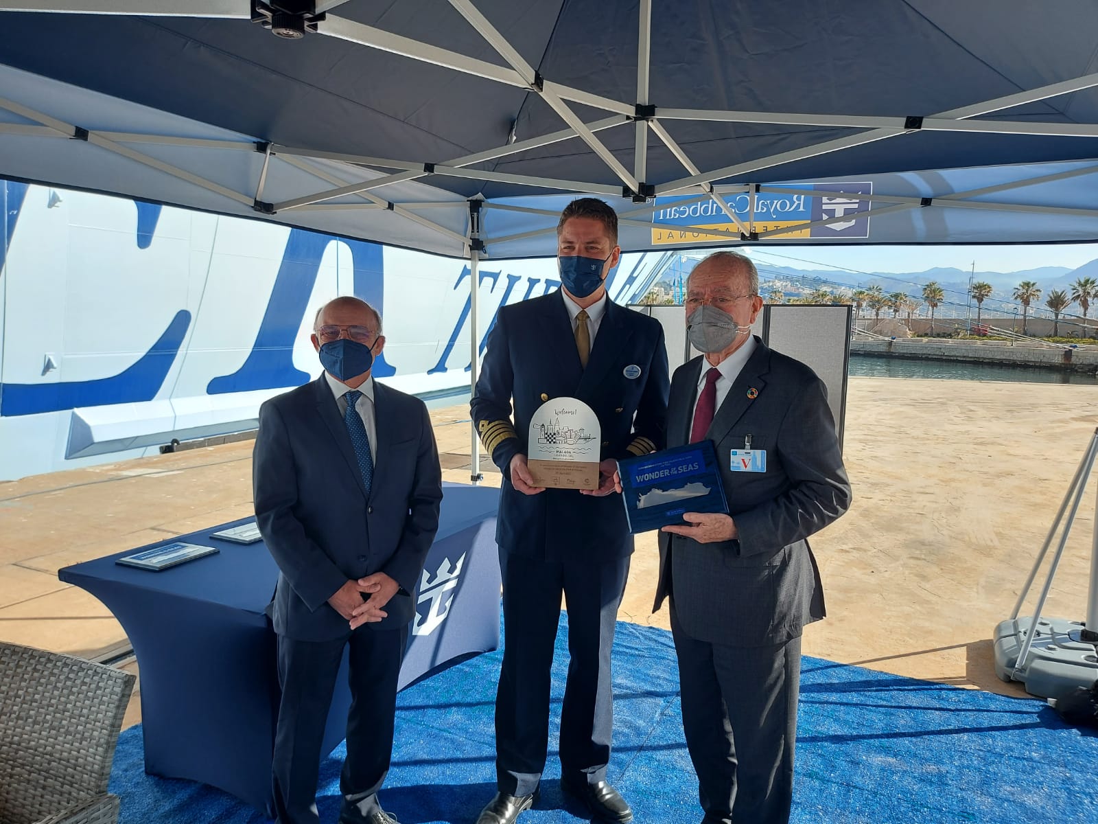El alcalde de Málaga, Francisco de la Torre, junto al presidente de la Autoridad Portuaria de Málaga, Carlos Rubio, la delegada de Turismo de la Junta de Andalucía, Nuria Rodríguez, y el concejal de Turismo del Ayuntamiento de Málaga, Jacobo Florido, ha asistido esta mañana al encuentro en la Terminal A de Cruceros con el buque ‘Wonder of the Seas’ de la naviera Royal Caribbean. Durante el mismo, ha tenido lugar el intercambio de placas conmemorativas entre las autoridades locales y el capitán Henrik. El ‘Wonder of the Seas’ ha realizado en la ciudad su primera parada en España y ha elegido Málaga como primer puerto de escala de Europa, procedente del Atlántico.