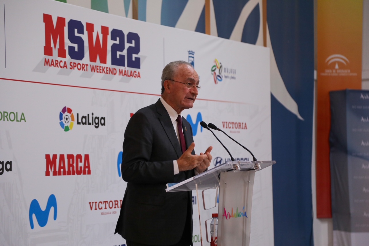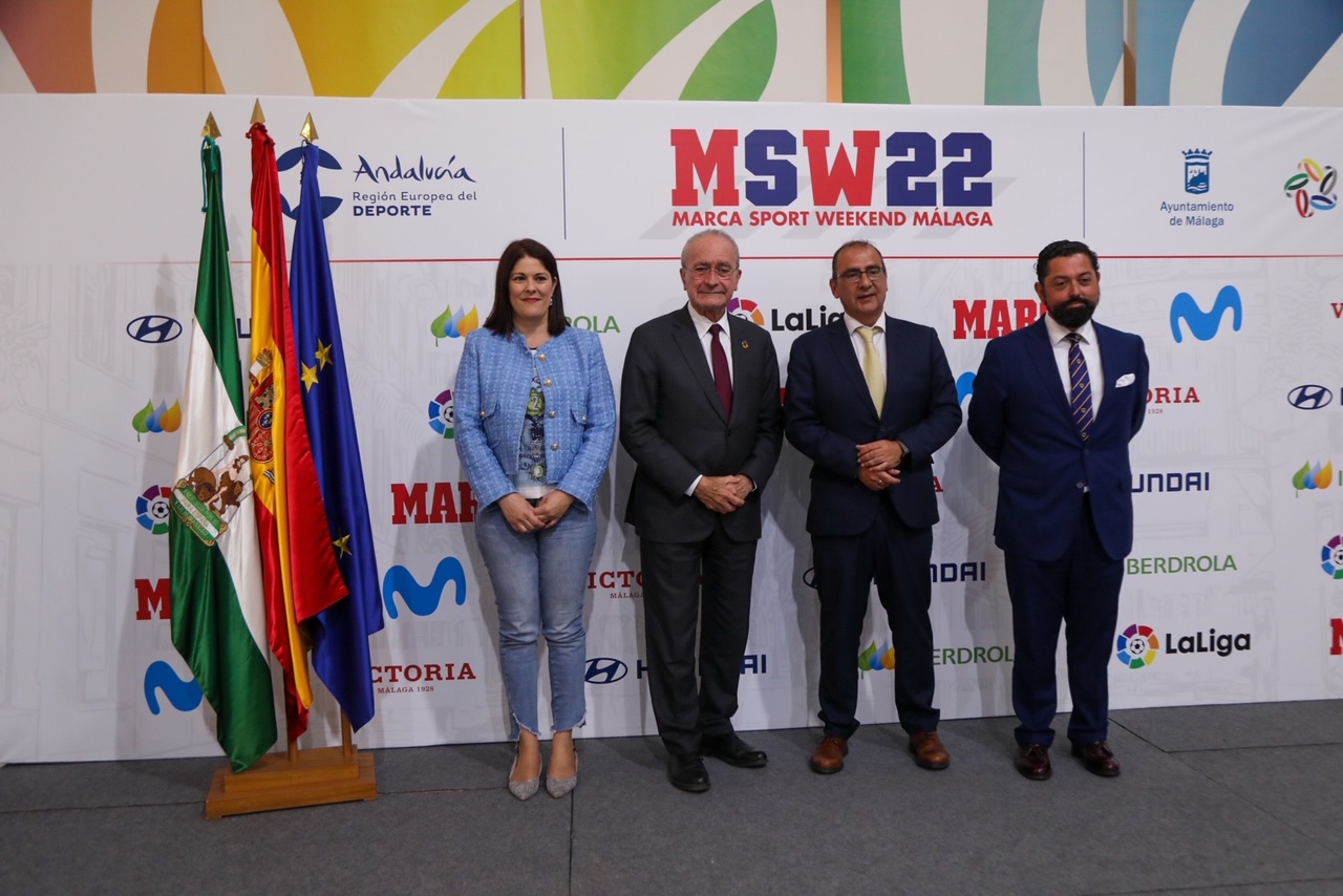 El alcalde de Málaga, Francisco de la Torre, junto a la concejala de Deporte, Noelia Losada, el secretario general para el Deporte de la Junta de Andalucía, José María Arrabal; y el director de Marca, ha asistido esta mañana a la presentación de ‘Marca Sport Weekend’. Se trata de un evento deportivo del diario Marca que se celebrará en nuestra ciudad los próximos 10, 11 y 12 de junio.