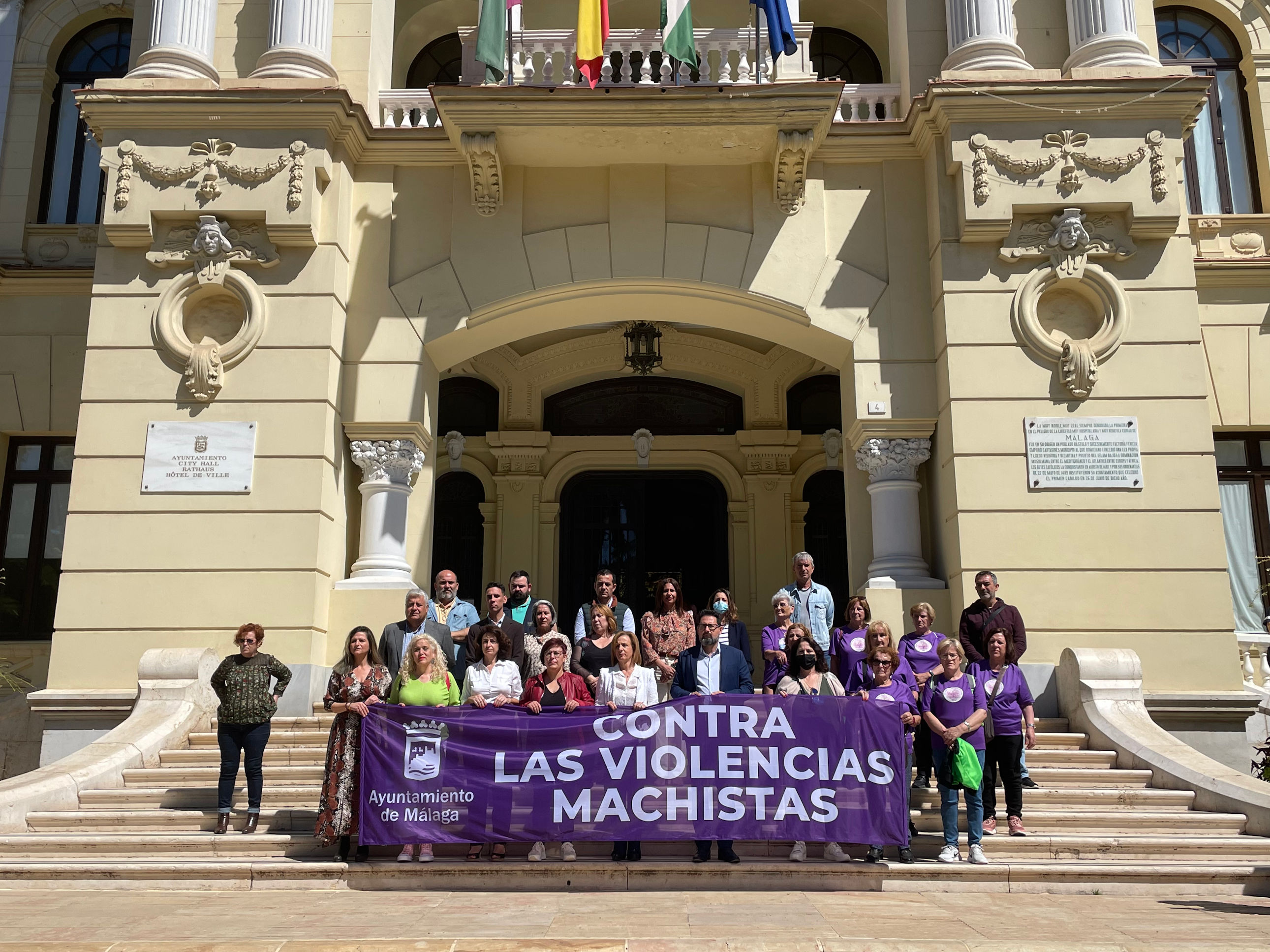 Miembros de la Corporación Municipal mantienen un minuto de silencio en memoria de la última víctima de la violencia de género confirmada, mujer asesinada en Cuenca el pasado 2 de mayo. El acto ha tenido lugar en las escaleras exteriores del edificio del Ayuntamiento de la Málaga.