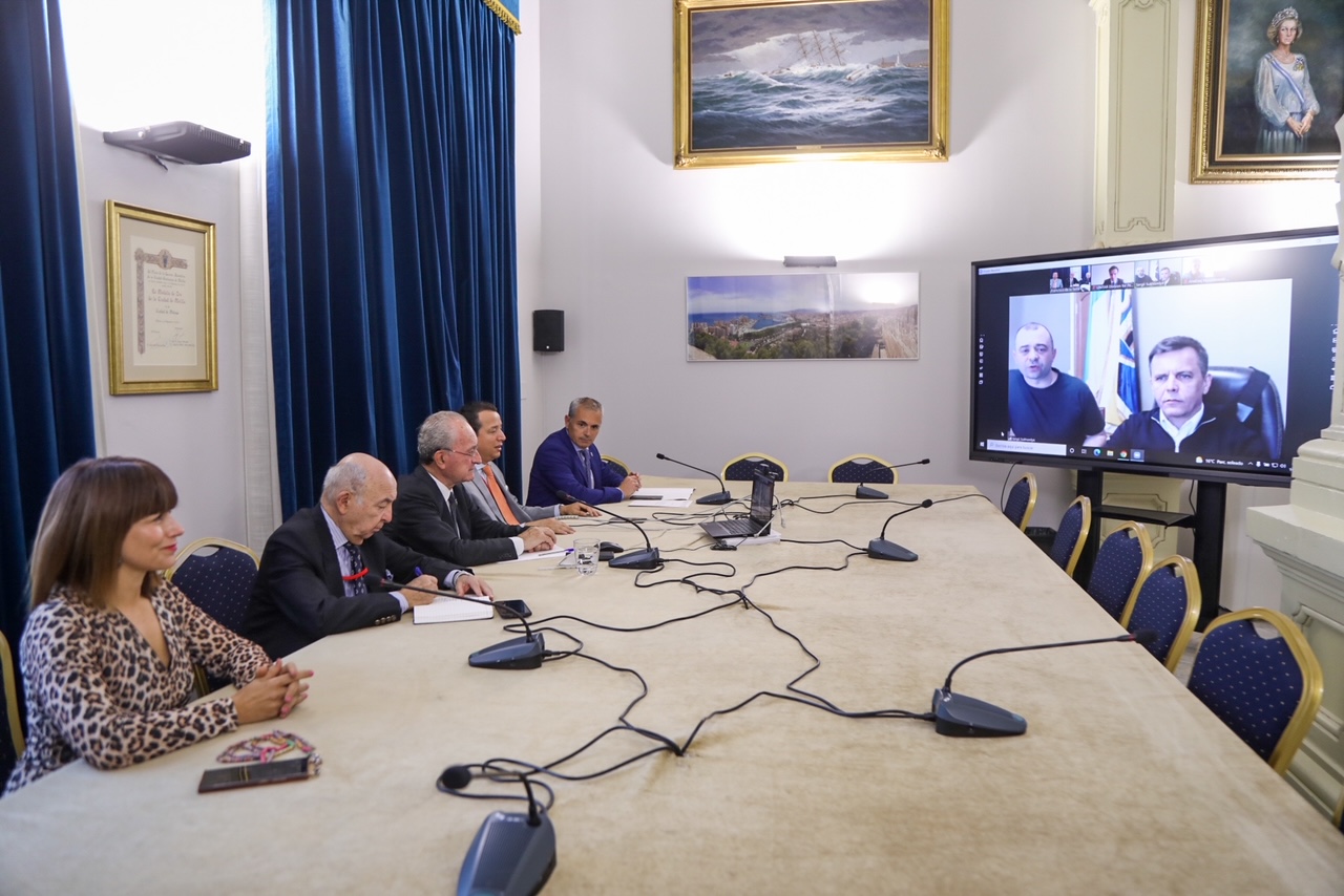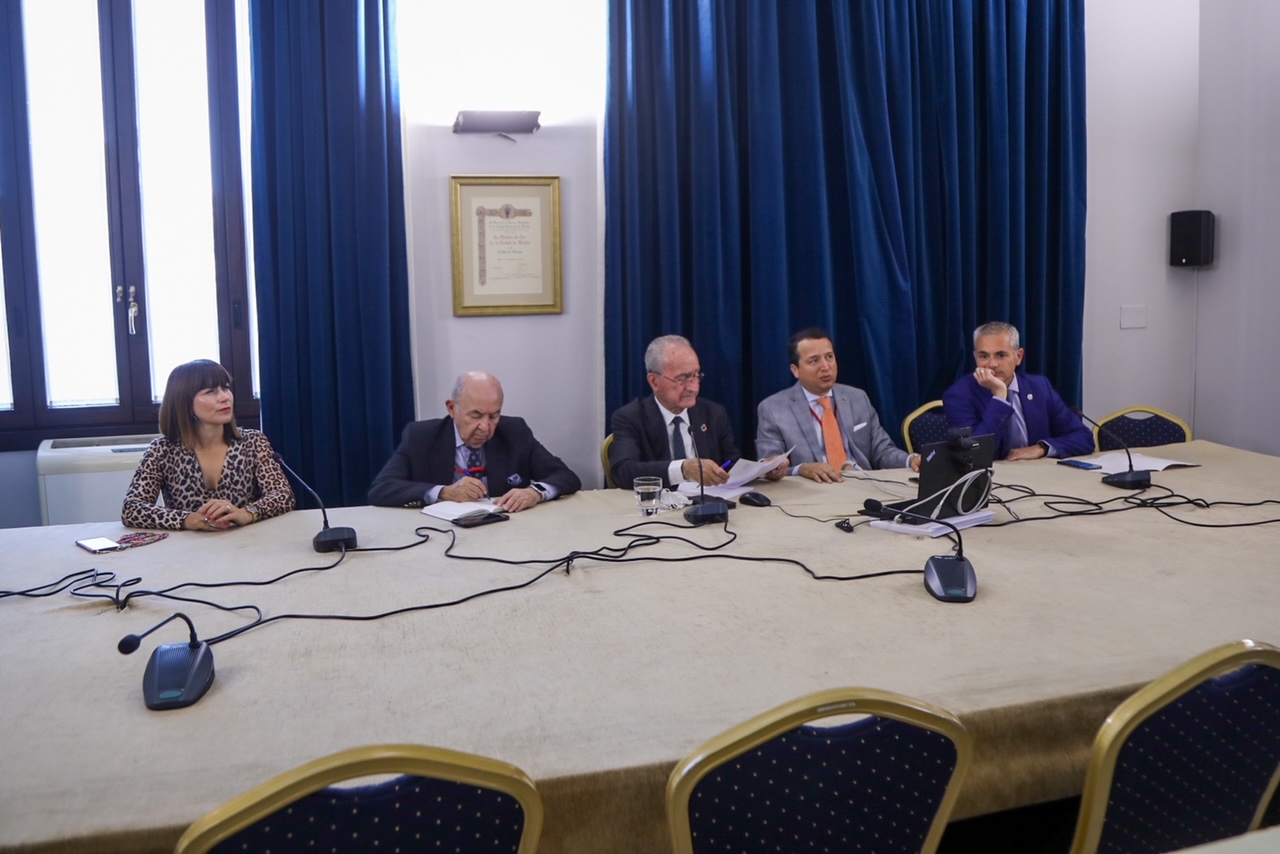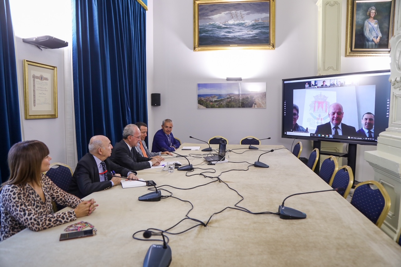 El alcalde, Francisco de la Torre, acompañado por la concejala de Acción Exterior, Ruth Sarabia; el responsable de la Red Global CIFAL, Álex Mejía; el presidente del directorio de UNITAR, Luis Gallegos; y el director de CIFAL Málaga, Julio Andrade; ha mantenido esta mañana una reunión telemática con los alcaldes de Plock (Polonia), Andrzej Nowakowsky, y Zhytomyr (Ucrania), Serhij Suchomlyn.