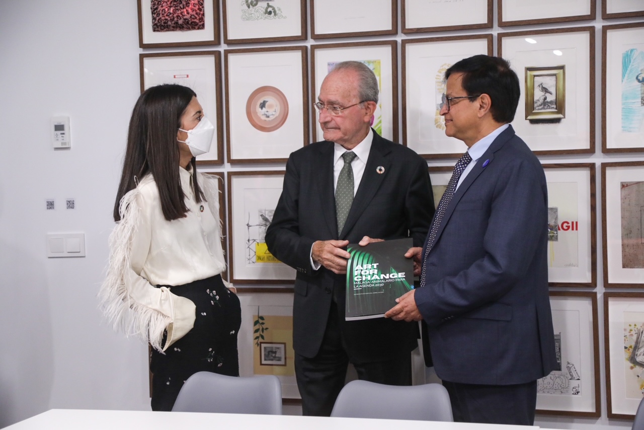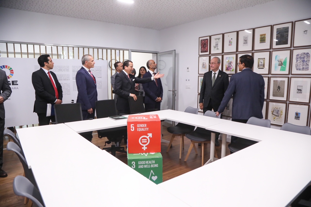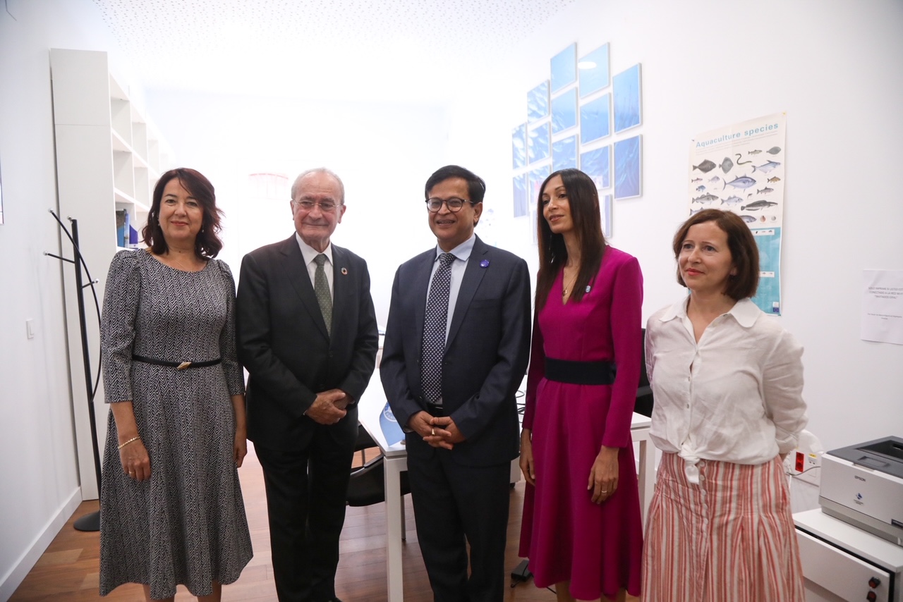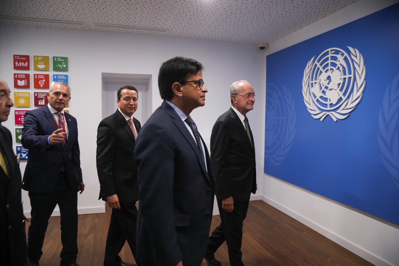 El alcalde de Málaga, Francisco de la Torre, junto a miembros de la Corporación municipal, y al secretario general adjunto de la Organización de las Naciones Unidas y director ejecutivo de Unitar, Nikhil Seth, ha asistido esta mañana al izado de la bandera de la ONU en la Casa de las Naciones Unidas en Málaga (UN House) y han visitado las instalaciones ubicadas en el edificio del antiguo Hospital Noble. También han asistido diferentes representantes de las agencias de Naciones Unidas con presencia en Málaga y miembros y colaboradores de CIFAL Málaga. La oficina de Málaga acoge desde hace meses diversas dependencias de UNITAR, FAO, OIM y ACNUR, entre otros organismos y agencias de Naciones Unidas.