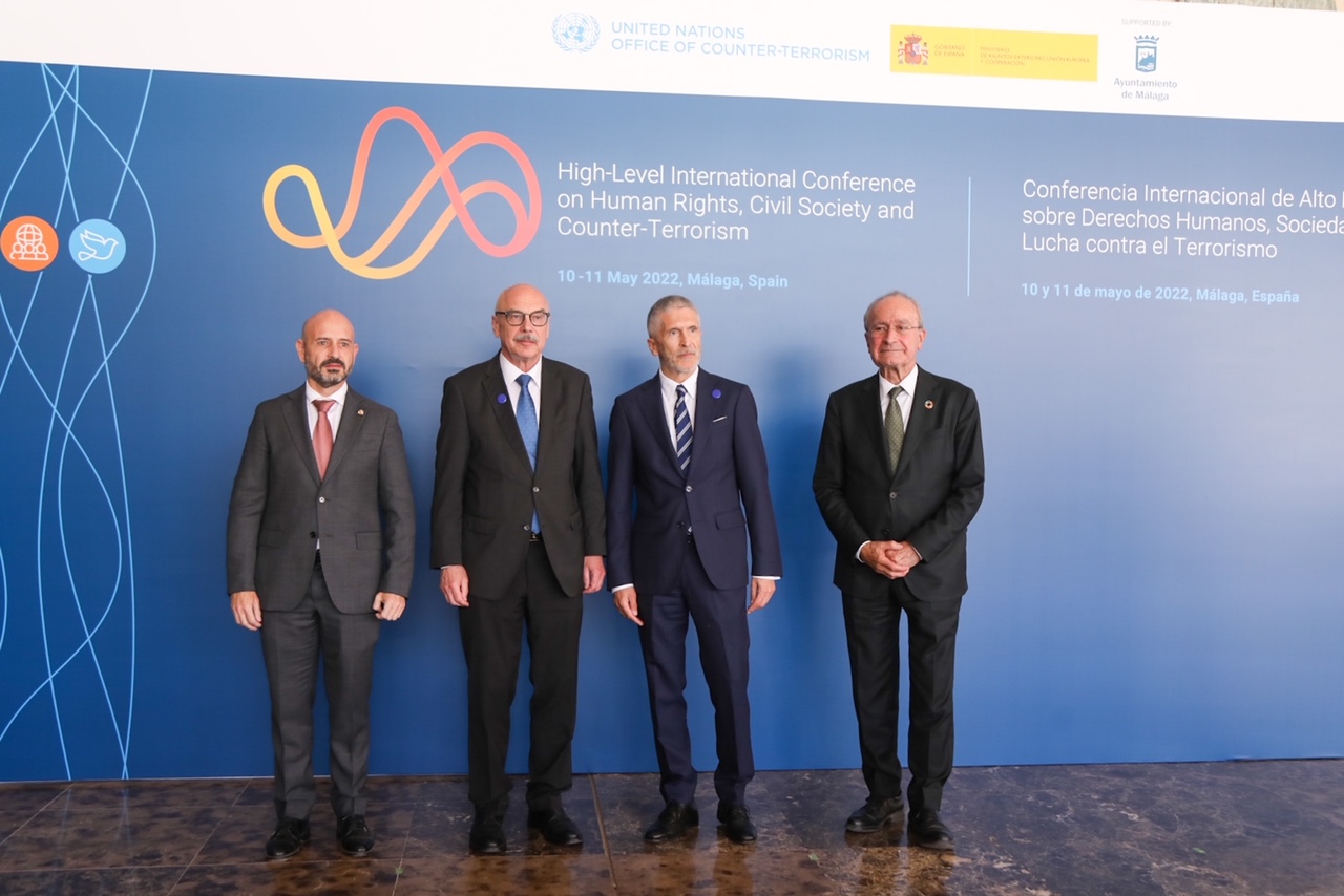 El alcalde de Málaga, Francisco de la Torre, ha asistido hoy a la clausura de la Conferencia de Alto Nivel sobre Derechos Humanos, Sociedad Civil y Lucha contra el Terrorismo, que se ha celebrado en el Palacio de Ferias y Congresos de Málaga (Fycma). La clausura ha contado con la presencia del ministro del Interior, Fernando Grande-Marlaska, y del secretario general adjunto de Naciones Unidas, Vladimir Voronkov. Los días 10 y 11 de mayo se ha celebrado en Málaga esta Conferencia de Alto Nivel, coorganizada por el Ministerio de Asuntos Exteriores, Unión Europea y Cooperación de España y la Oficina de Naciones Unidas para la Lucha contra el Terrorismo (UNOCT), y con el apoyo del Ayuntamiento de Málaga.