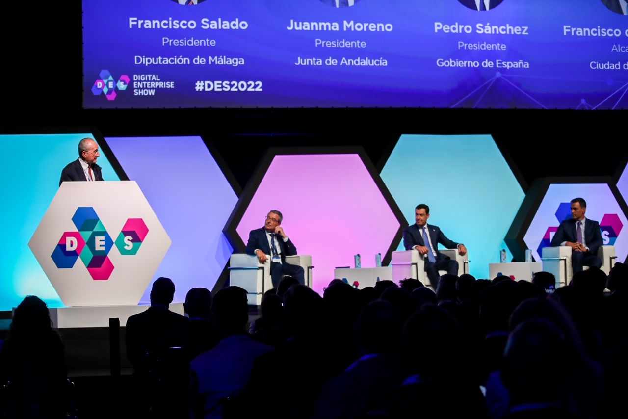 Hoy tiene lugar en el Palacio de Ferias y Congresos de Málaga la ceremonia inaugural de DES-Digital Enterprise Show 2022. El acto ha contado con la presencia del alcalde de Málaga, Francisco de la Torre, el presidente del Gobierno, Pedro Sánchez; el presidente de la Junta de Andalucía, Juan Manuel Moreno; y el presidente de la Diputación de Málaga, Francisco Salado. Digital Enterprise Show (DES2022) es el evento internacional líder en Transformación Digital, que tse celebra entre los días 14-16 de junio en Málaga. Un evento que reúne a directivos y profesionales procedentes de más de 50 países para adquirir conocimientos, habilidades y descubrir las últimas soluciones tecnológicas con el fin de transformar sus organizaciones o áreas de gestión. DES es una plataforma donde se logra la sinergia entre conocimiento y experiencia, donde surgen nuevas formas de hacer negocios, implementar nuevas soluciones e ideas. Unimos tecnologías de vanguardia en el área de expositores y compartimos experiencias y casos de éxito en el Digital Business World Congress, todo para inspirar y empoderar a nuestros visitantes para poder acelerar la transformación digital en sus respectivas empresas.
