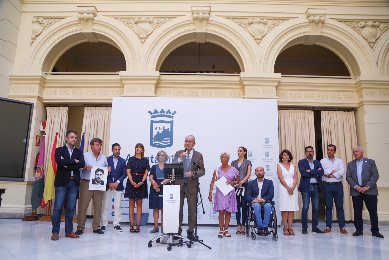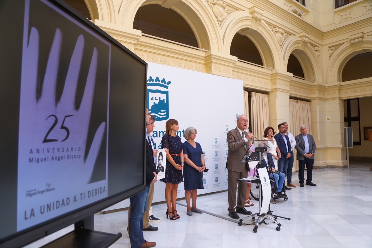 El Alcalde de Málaga, Francisco de la Torre, junto a miembros de la Corporación Municipal, ha asistido esta mañana al acto organizado por la Fundación Miguel Ángel Blanco y a la lectura del manifiesto con motivo del XXV aniversario del asesinato del concejal popular de Ermua. Dori Arrabali, de la Asociación de Víctimas del Terrorismo, ha sido la encargada de leer el manifiesto en el Patio de Banderas del Ayuntamiento. Posteriormente, se han mantenido 5 minutos de silencio en recuerdo de las víctimas del terrorismo convocados por la FEMP en la puerta del Ayuntamiento.