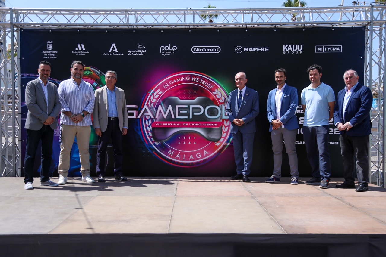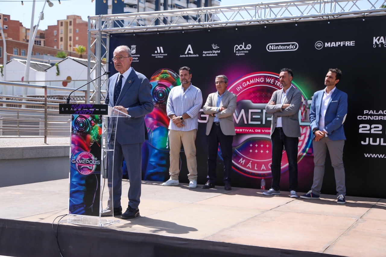 El alcalde de Málaga, Francisco de la Torre, junto al presidente de la Diputación de ;álaga, Francisco Salado; el director gerente de la Agencia Digital, Raúl Jimenez; el jefe de Producto de Nintendo España, Alejandro Fernández y el CEO de Kaiju Group, Javier Ramos, ha asistido esta mañana a la presentación del programa oficial de Gamepolis 2022 que se celebra entre el 22 y el 24 de julio en el Palacio de Ferias y Congresos de Málaga.