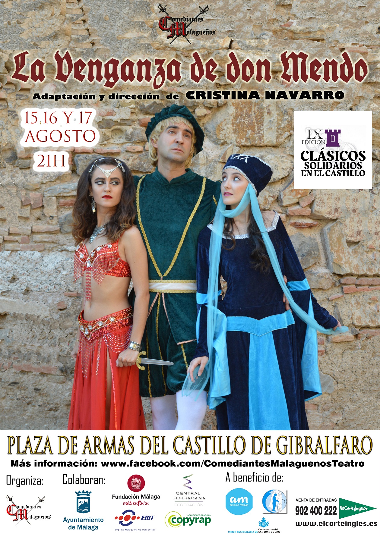Un año más, y ya van nueve, “Comediantes Malagueños Teatro”, vuelve a representar una obra de teatro clásica en el Castillo de Gibralfaro, siendo el primer grupo de teatro que hace una representación en tan emblemático lugar. Siempre, desde 2014, todo lo recaudado en “Clásicos Solidarios en el Castillo” ha ido destinado a un fin benéfico, y este año no iba a ser diferente. La taquilla íntegra de los tres días irá a tres asociaciones: EL ASILO DE LAS HERMANITAS DE LOS POBRES, CENTRO DE ACOGIDA DE SAN JUAN DE DIOS Y AUTISMO MÁLAGA. La cultura siempre unida a la solidaridad.