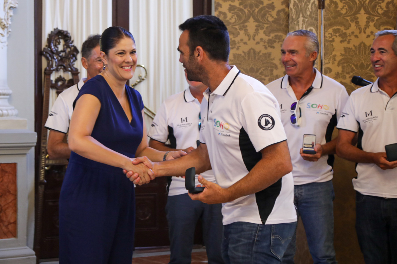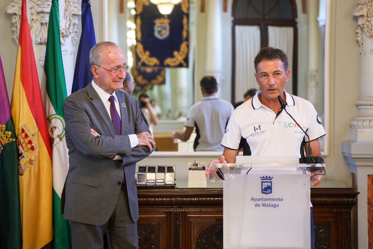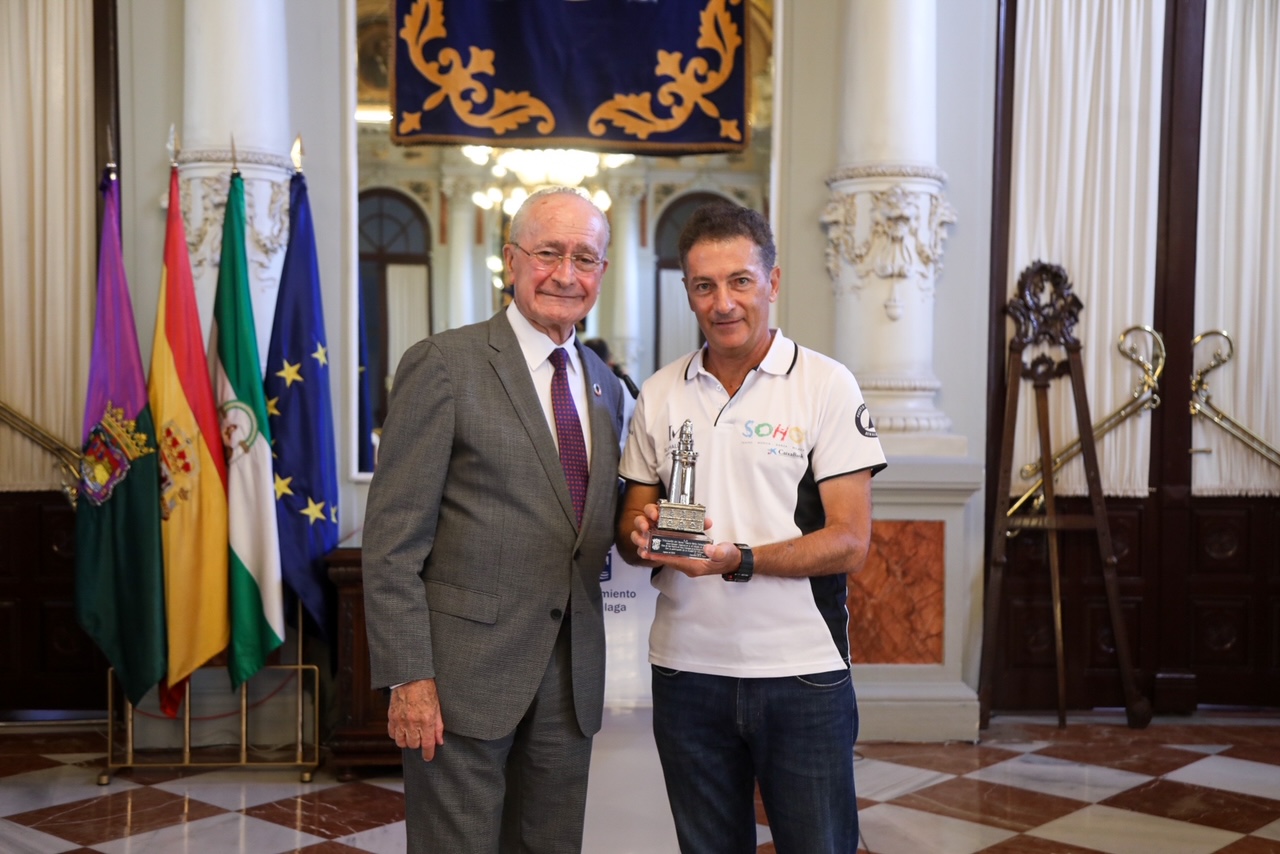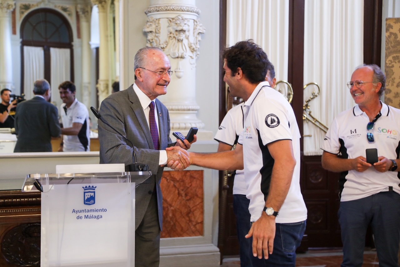 El alcalde de Málaga, Francisco de la Torre, junto a la concejala de Deporte, Noelia Losada, ha recibido esta mañana en el Salón de los Espejos del Ayuntamiento al equipo del Teatro Soho Caixabank, ganadores de la XL Copa del Rey Mapfre de Vela.