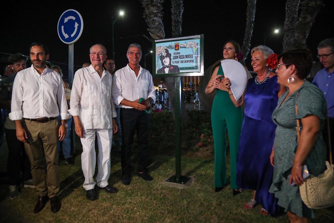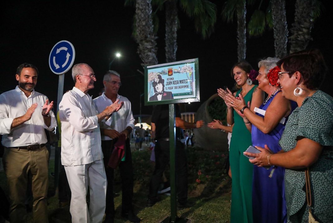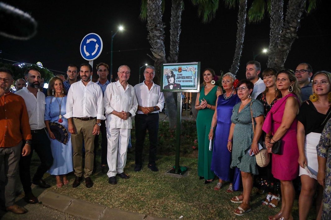 Desde el sábado 13 por la noche, una rotonda del real de Cortijo de Torres, recuerda a Juan Rosa Mateo ‘El Pulga’, uno de los componentes del Dúo Sacapuntas, junto a Manuel Sarria. El alcalde de Málaga Francisco de la Torre,y la pregonera de la Feria María Peláe, acompañados de la concejala de Servicios Operativos y Fiestas, Teresa Porras, Manuel Sarria, concejales del Ayuntamiento y amigos, han descubierto la placa que se encuentra en la rotonda conocida como de ‘las vasijas’ en la calle José Blánquez ‘El Maño’ del recinto Ferial.