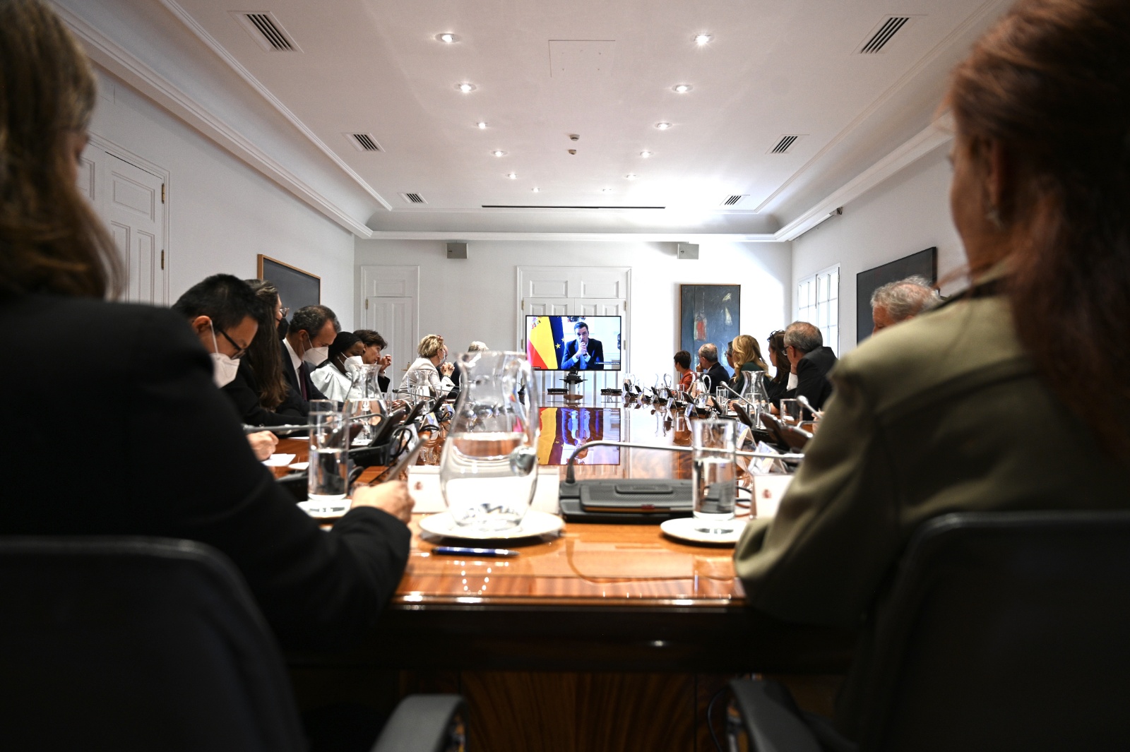 Encuentro de la delegación del BIE en el Palacio de la Moncloa, en el que ha participado por videoconferencia el presidente del Gobierno, Pedro Sánchez, junto a la representación de las instituciones (Ministerio de Exteriores, Ayuntamiento de Málaga, Junta de Andalucía y Diputación Provincial) que integran la candidatura de la Expo 2027 Málaga ‘La era urbana: hacia la ciudad sostenible’ y a la que ha asistido el alcalde de Málaga, Francisco de la Torre.