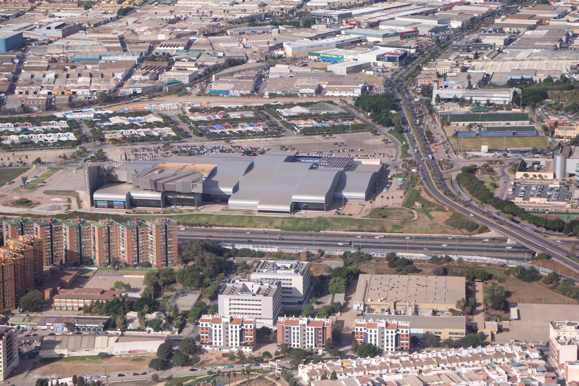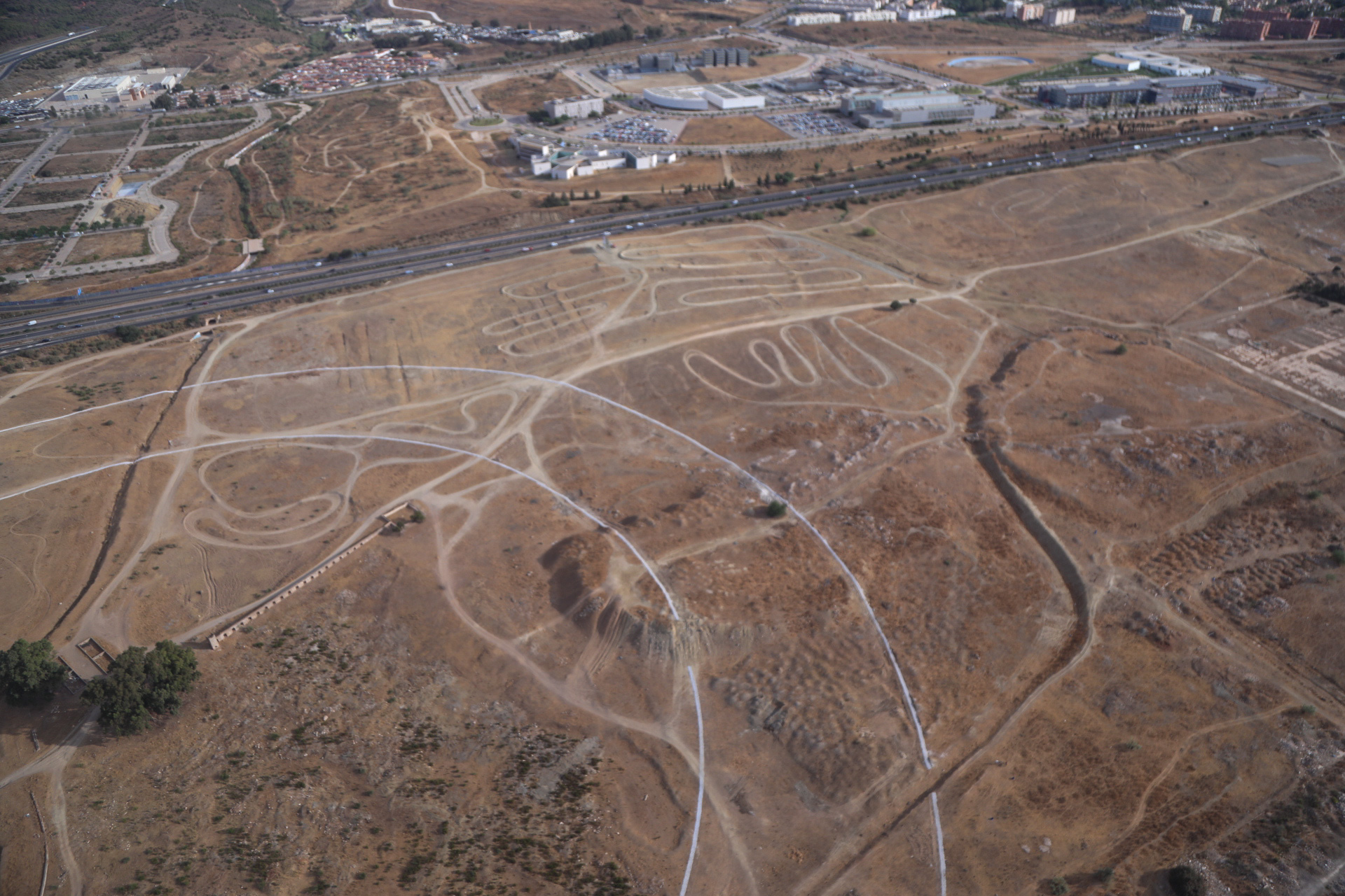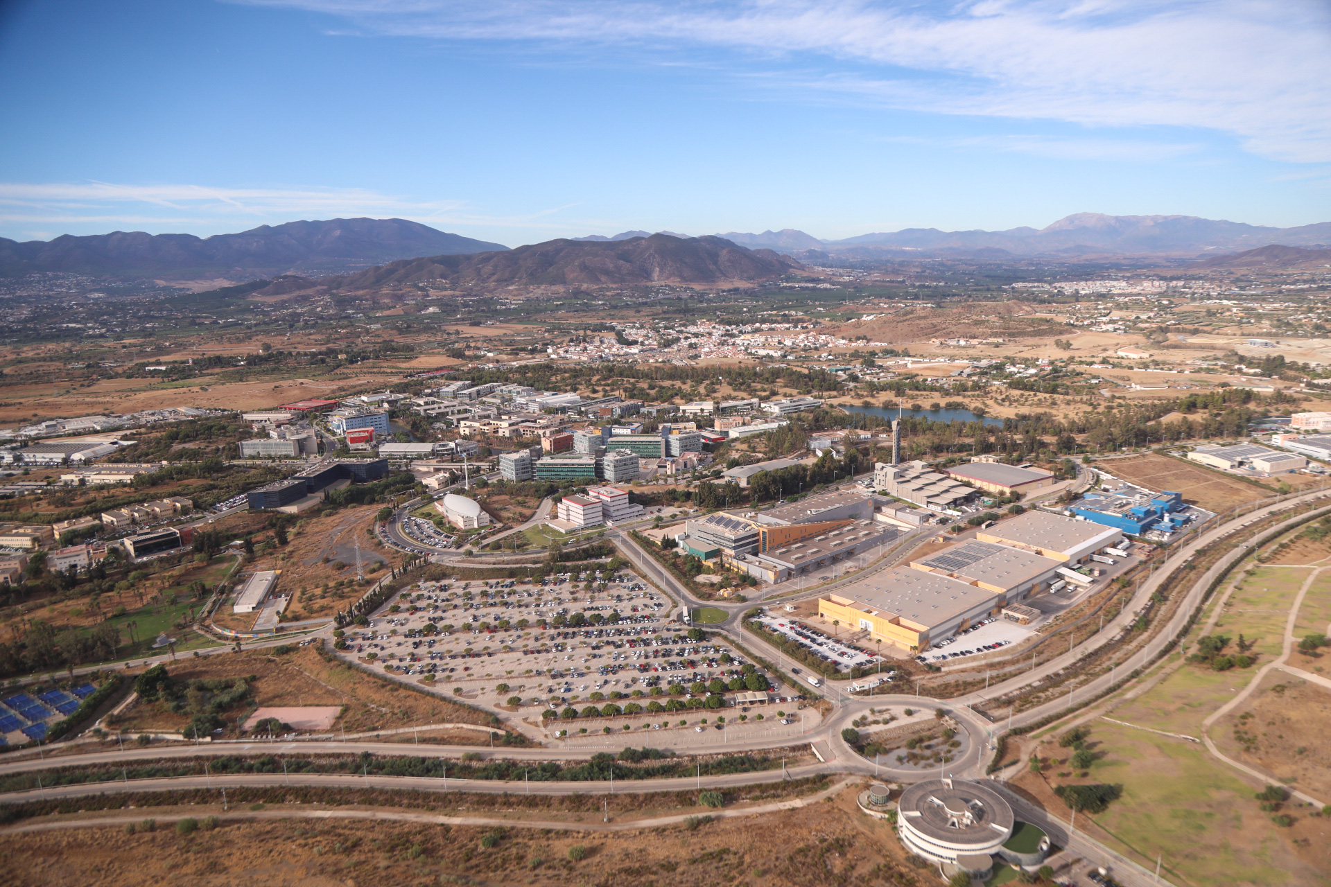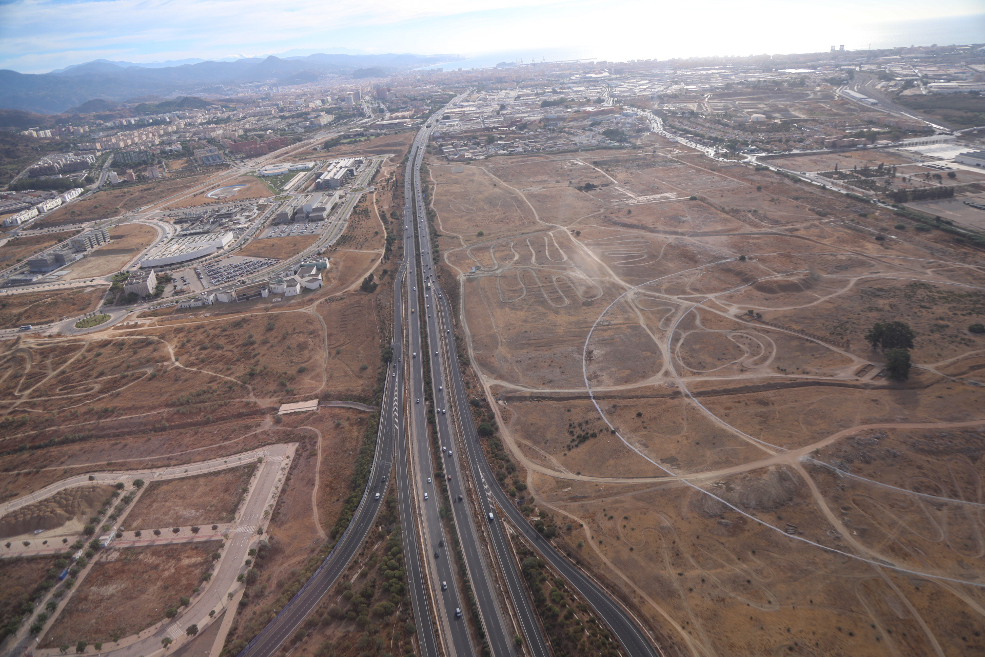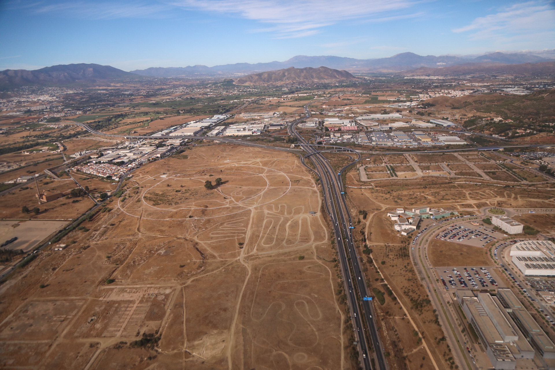 En la parcela, ubicada en el distrito de Campanillas, se han dibujado las superficies del anillo y los pabellones al objeto de facilitar la identificación de los espacios en la vista aérea. El vuelo ha discurrido igualmente por el Málaga TechPark y el campus de Teatinos, las principales infraestructuras de transporte de la ciudad y el área metropolitana.