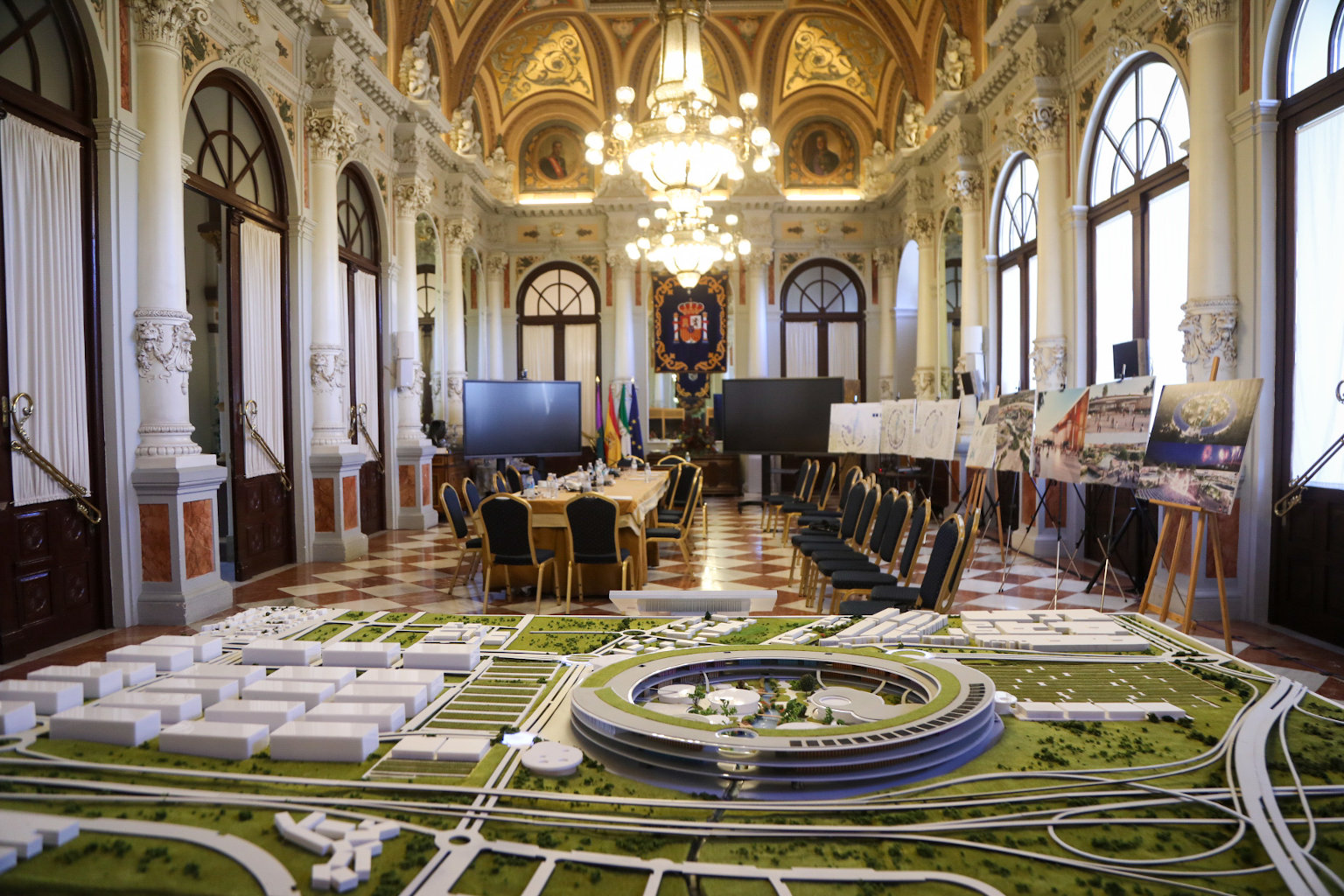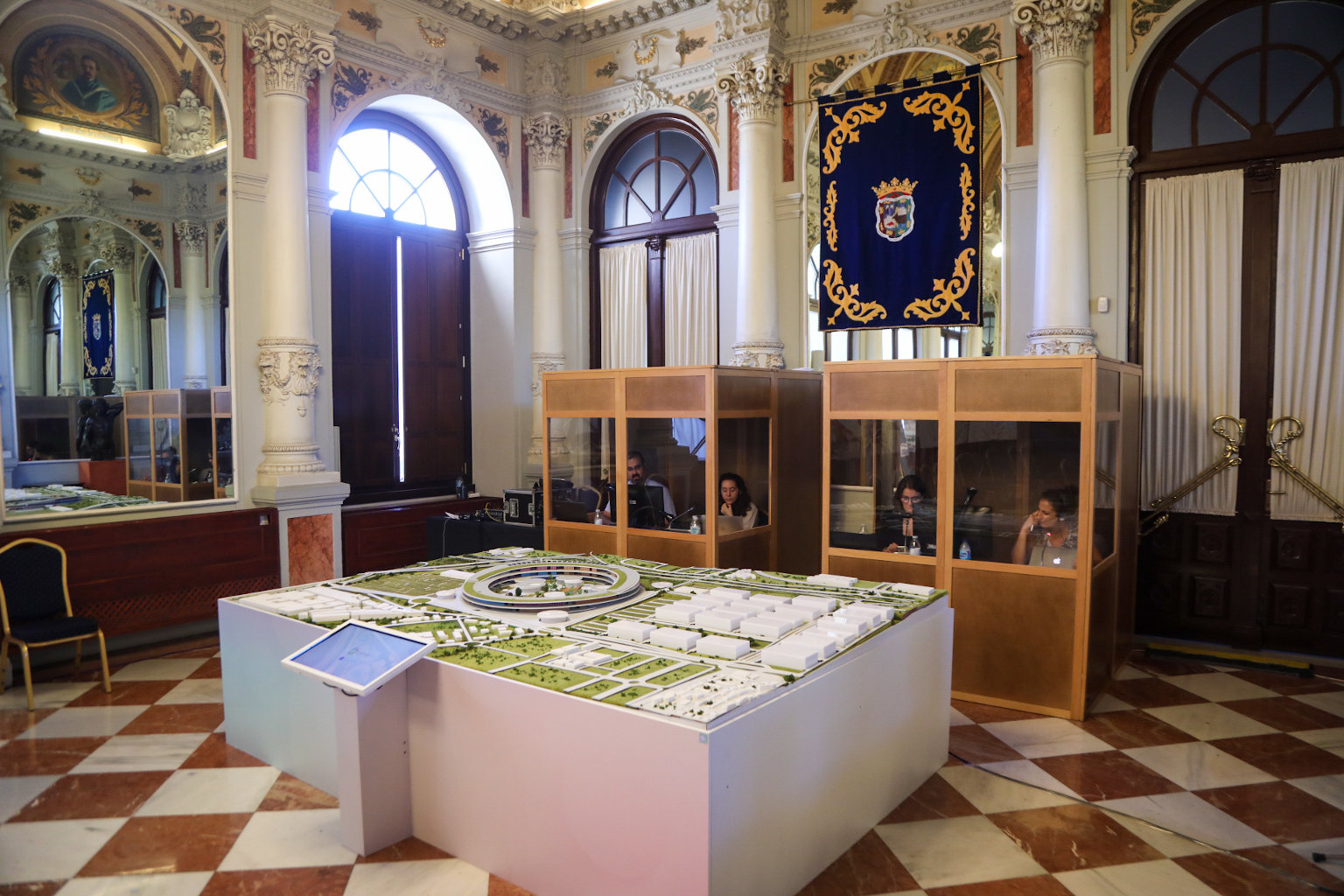 La maqueta interactiva de parcela de la Expo 2027 se ha instalado estos días en el Salón de los Espejos con motivo de la visita de la delegación de la Oficina Internacional de Exposiciones (BIE) en misión de evaluación de la candidatura de Málaga