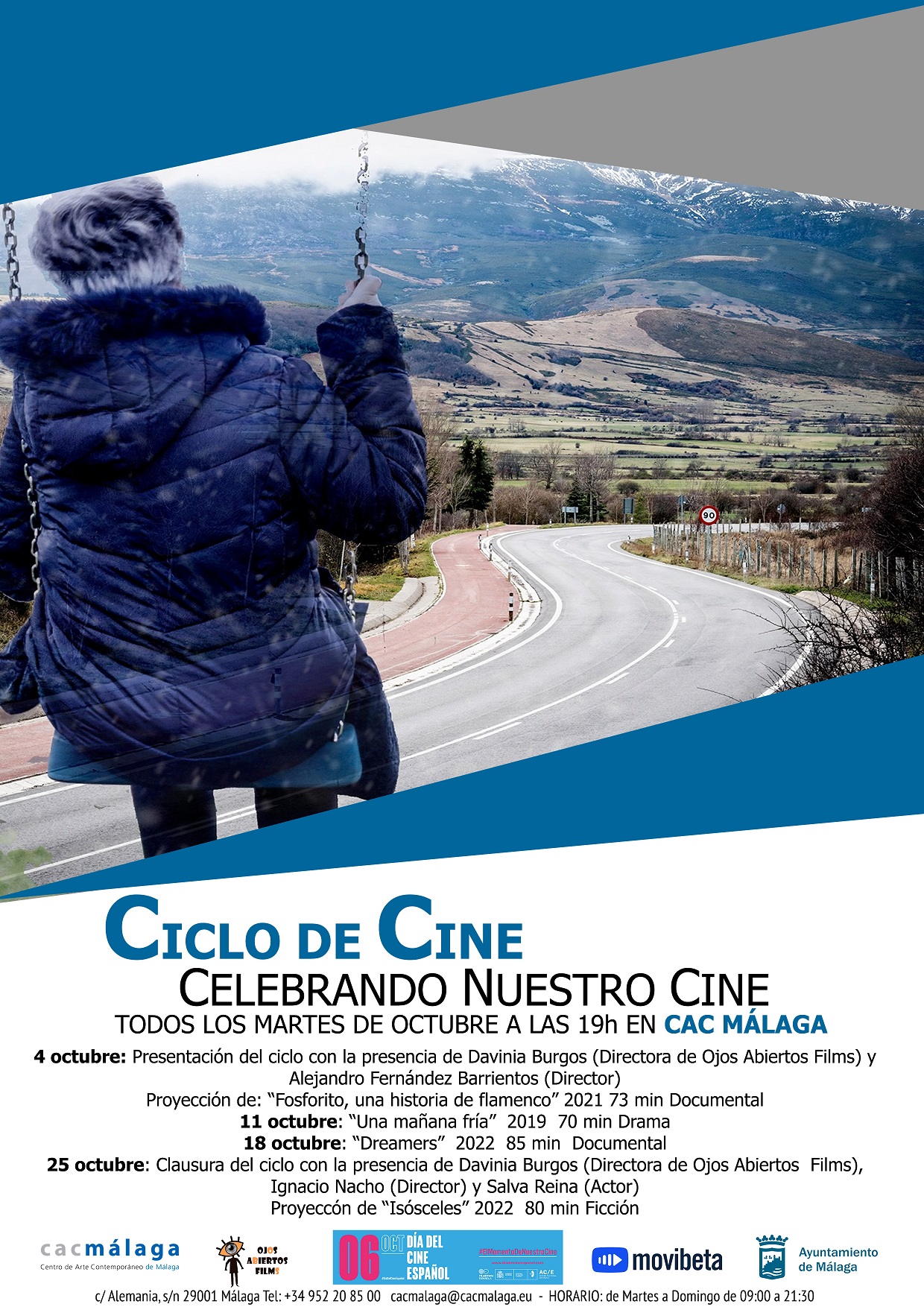 Con motivo de la celebración del Día del Cine Español que tiene lugar el 06 de octubre, el CAC Málaga organiza en colaboración con la productora, distribuidora y gestora cultural, Ojos Abiertos Films, el ciclo de cine español y malagueño “ Celebrando nuestro cine ” con la proyección de cuatro películas que tendrá lugar del 04 al 25 de octubre a las 19:00 horas en el salón de actos del centro. La asistencia al evento requiere de inscripción mediante la plataforma Evenbrite.
