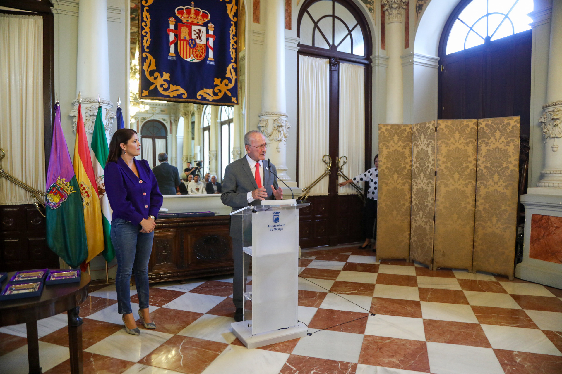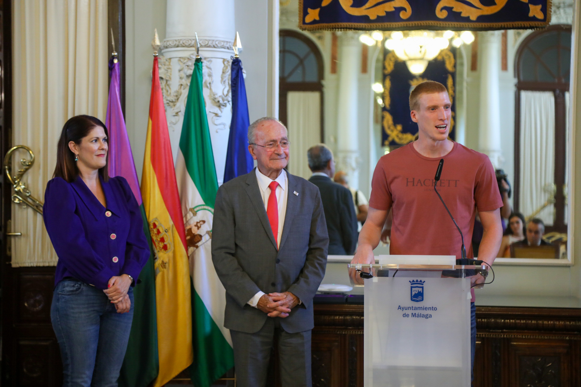 El alcalde de Málaga, Francisco de la Torre, acompañado de la concejala de Deporte, Noelia Losada, y más miembros de la Corporación municipal, ha recibido esta tarde en el Salón de los Espejos del Ayuntamiento a los medallistas de oro de la Selección Española de Baloncesto y jugadores del Unicaja Baloncesto, Alberto Díaz y Darío Brizuela.