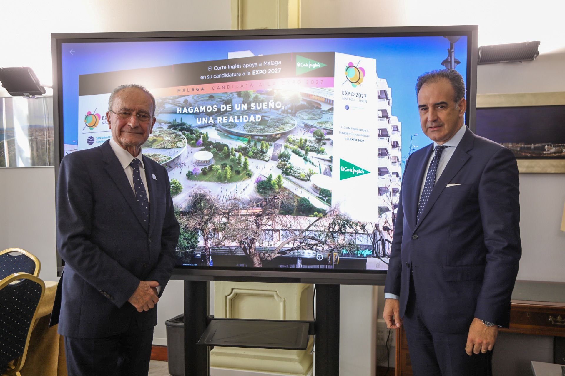 El alcalde de Málaga, Francisco de la Torre, y el director regional de Andalucía Oriental de El Corte Inglés, Venerando López Blanco, han mantenido hoy un encuentro en el Ayuntamiento en el que han presentado la imagen que lucirá la lona de más 1.000 m2 en apoyo a la candidatura de Málaga a la Expo Internacional 2027.