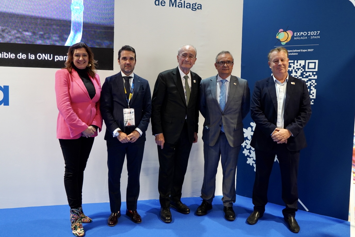 El alcalde de Málaga, Francisco de la Torre, junto al embajador en misión especial para la Candidatura Expo 2027 Málaga, Juan José Escobar, el concejal de Turismo, Jacobo Florido, la diputada de la delegación de Desarrollo Económico Sostenible de la Diputación de Málaga, Esperanza González Pazos, y el director general del Ayuntamiento para la Expo 2027, Jerónimo Blasco, han asistido esta mañana a la presentación de la candidatura de Málaga a la Expo 2027 que se ha desarrollado en el expositor de la ciudad en Fitur 2023.