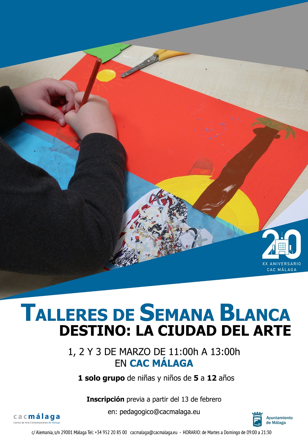 El CAC Málaga, dentro del marco de celebración de su XX Aniversario, celebra los talleres vacacionales de Semana Blanca “Destino: La ciudad del arte” dirigido a niños y niñas de entre 5 y 12 años. Estos talleres constarán de 3 sesiones continuadas para un mismo grupo compuesto por un máximo de 25 participantes: 1, 2 y 3 de marzo de 11:00 a 13:00 horas. Se trata de una actividad gratuita en la que es necesaria inscripción a través del email pedagogico@cacmalaga.eu [mailto:pedagogico@cacmalaga.eu] y se abrirán el lunes 13 de febrero. El aforo se completará por riguroso orden de llegada de cada inscripción.