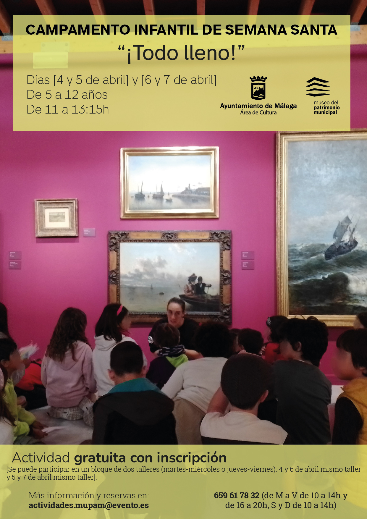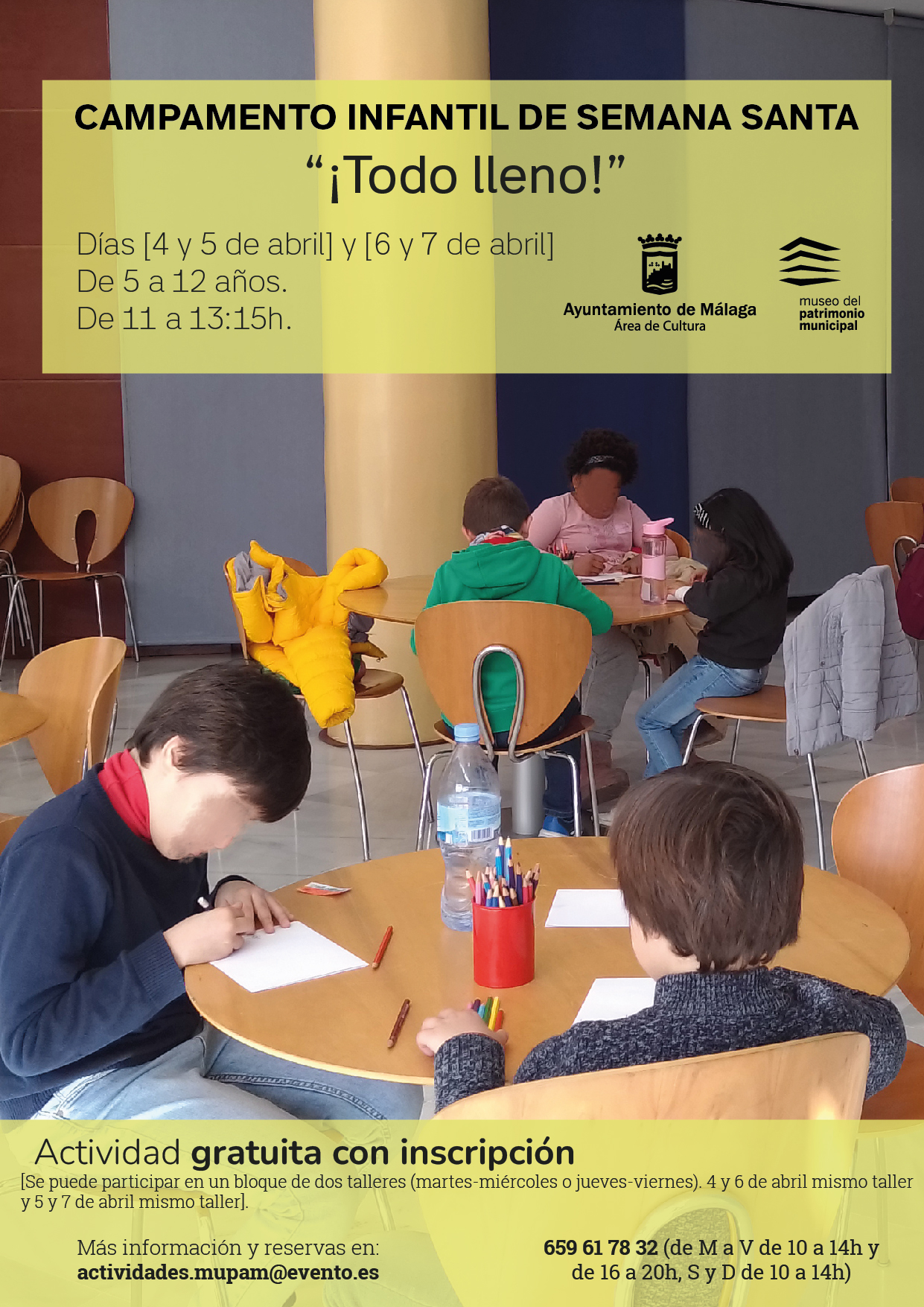 EL MUPAM PROGRAMA EL CAMPAMENTO INFANTIL PARA SEMANA SANTA TITULADO ‘¡TODO LLENO!’ 23/3/2023 Imagen Se ofrecen talleres gratuitos para disfrutar de las obras expuestas y realizar actividades plásticas Documentos NOTA INFORMATIVA.pdf 372,44 KB kb Galería de imágenes