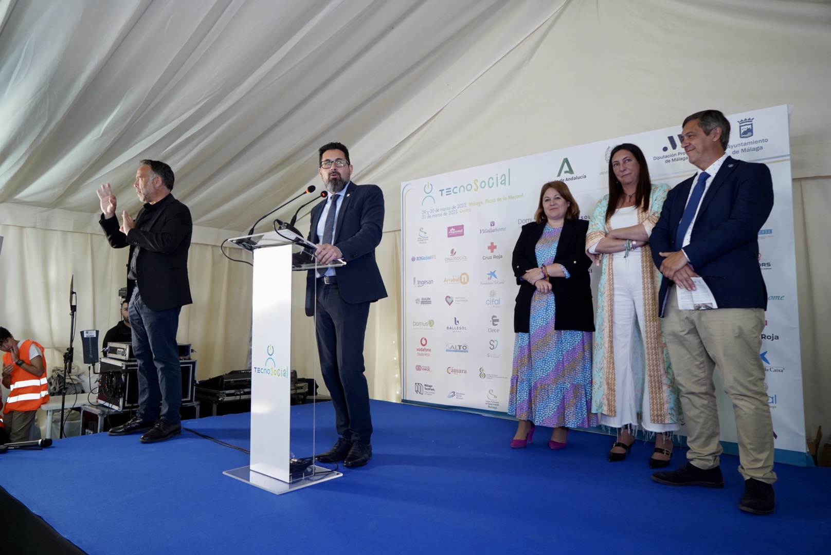 El concejal de Derechos Sociales, Francisco Pomares, junto a la consejera de Inclusión social, Juventud, Familias e Igualdad, Loles López, la vicepresidenta segunda de la Diputación de Málaga, Natacha Rivas, y el vicerrector de Investigación y Transferencia de la Universidad de Málaga, Teodomiro López, ha participado esta mañana en la inauguración de la segunda edición de Tecnosocial, primera feria de España sobre Servicios Sociales y Autonomía Personal, Investigación e Innovación Tecnológica en el ámbito de los servicios y prestaciones del sistema público de servicios sociales de Andalucía.