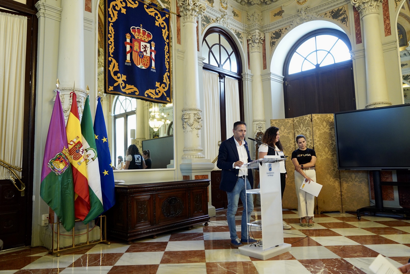 El alcalde de Málaga, Francisco de la Torre, junto a la concejala delegada de Acción Exterior, Mar Torres, y miembros de la Corporación Municipal, ha asistido esta mañana a la lectura del manifiesto con motivo del Día Mundial del Refugiado que se conmemora cada 20 de junio. Representantes de CEAR, Cruz Roja y ACCEM han sido los encargados de leer el manifiesto en el Salón de los Espejos del Ayuntamiento.