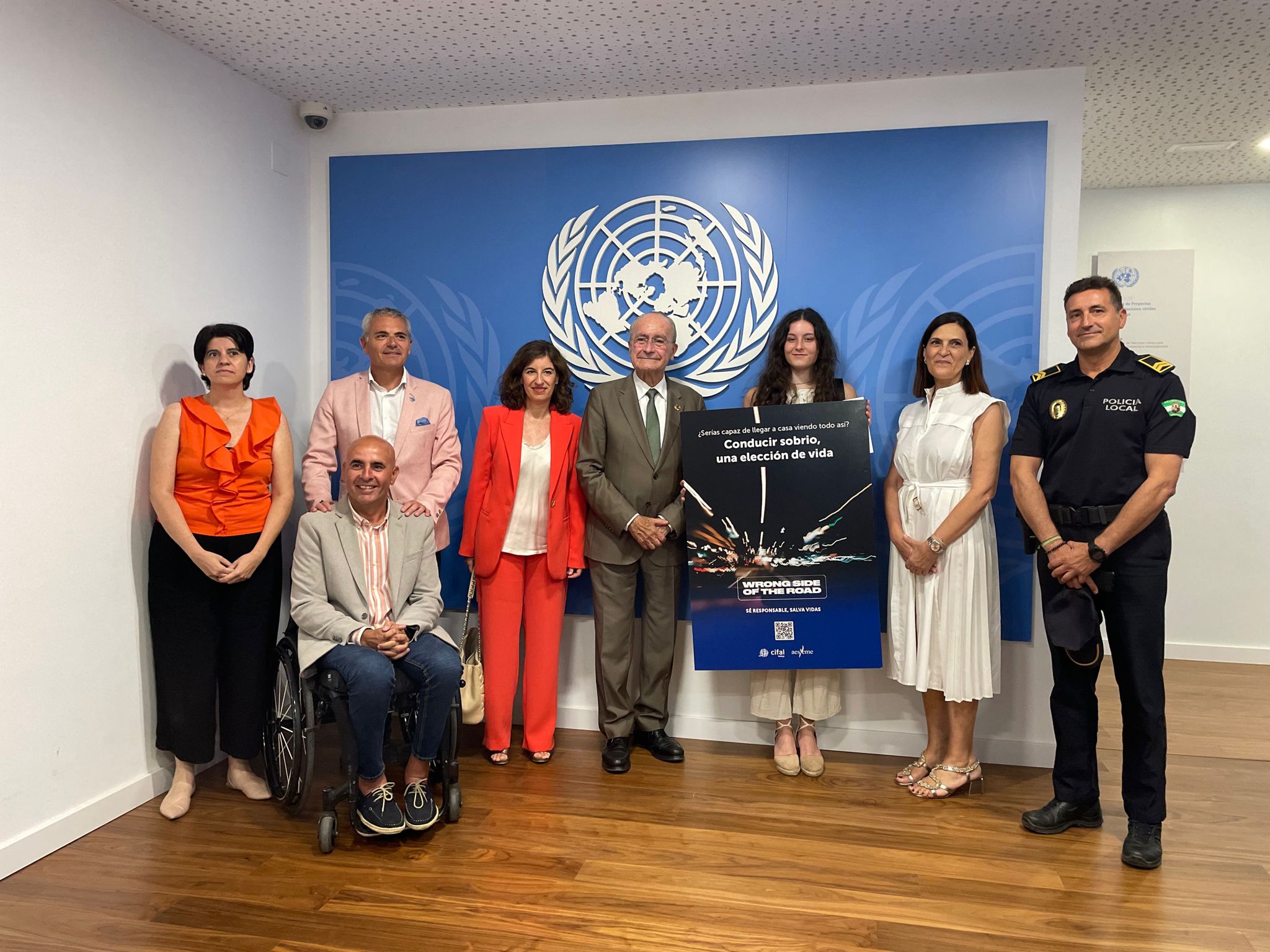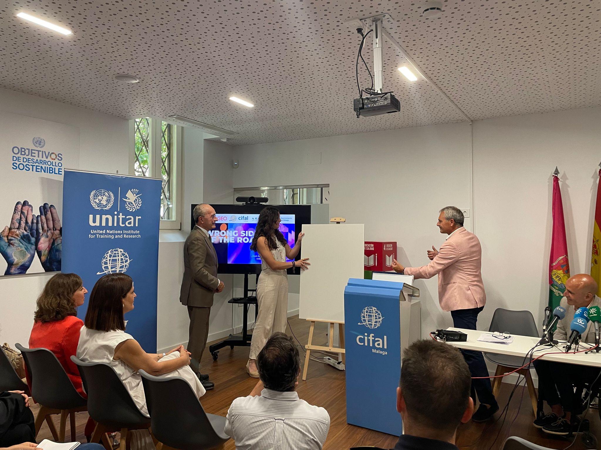 El alcalde de Málaga, Francisco de la Torre, acompañado de la concejala delegada de Movilidad, Trinidad Hernández, el director de CIFAL Málaga, Julio Andrade, el coordinador provincial de la Asociación de Víctimas de Accidentes de Tráfico, Sergio Hijano, y la jefa provincial de Tráfico, Aida Villaret, ha asistido a la entrega del premio del concurso de carteles de la campaña ‘ Wrong Side of the Road’ que ha ganado Rosa Sánchez Marzo, alumna de la Universidad de Cádiz, con su obra ‘Visión Deformada’. Dentro de la campaña ‘ Wrong Side of the Road ’, iniciativa que trata de concienciar sobre los riesgos de beber alcohol cuando se va a conducir, se convocó este concurso de carteles que ha contado con la colaboración de la Empresa Malagueña de Transportes (EMT) para su divulgación.