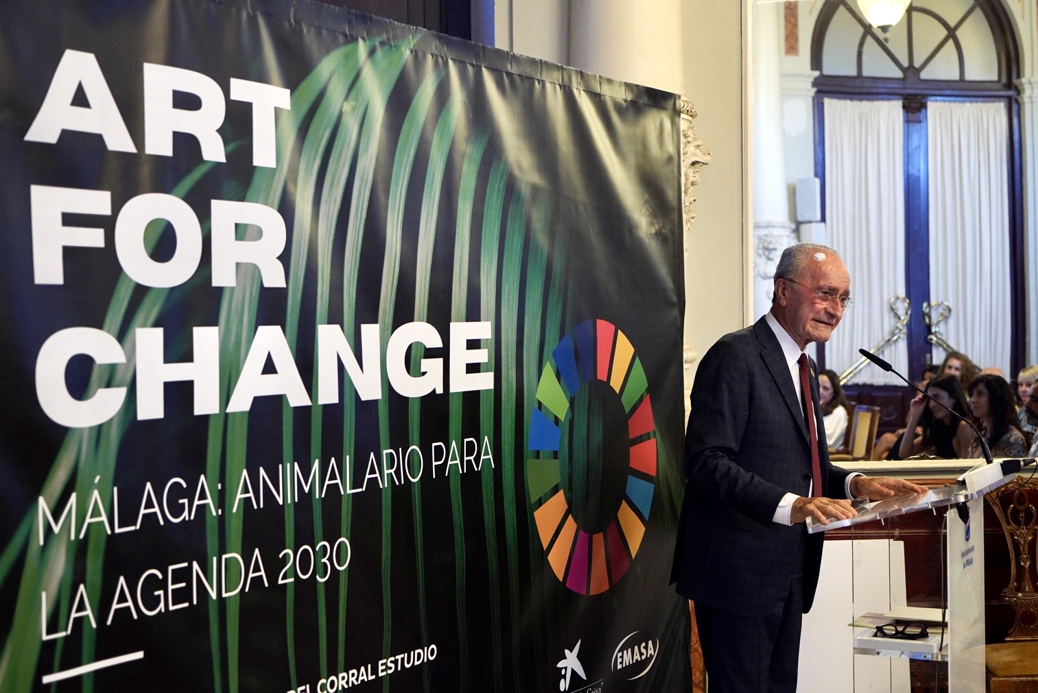 Esta tarde ha tenido lugar en el Ayuntamiento de Málaga, Salón de los Espejos, el acto de entrega de los fondos del proyecto ‘ Art For Change. Málaga: animalario para la agenda 2030’ , organizado por la gestora cultural, ideóloga y comisaria del proyecto Marta del Corral y el que ha participado el alcalde de Málaga, Francisco de la Torre, acompañado de las ediles de Cultura y Patrimonio Artístico y Sostenibilidad Medioambiental, Mariana Pineda y Penélope Gómez, respectivamente. Los fondos obtenidos tras la venta de las obras se han donado al Instituto Jane Goodall, la Fundación Santuario Gaia y la Sociedad Protectora de Animales y Plantas de Málaga. Esta proyecto está concebido para difundir los Objetivos de Desarrollo Sostenible (ODS) de Naciones Unidas a través de la cultura y ha sido galardonado por el Ayuntamiento de Málaga la Fundación “la Caixa”. Ha contado con la participación de cien artistas malagueños de distintas generaciones participan en este proyecto solidario. Enrique Brinkmann, Francisco Peinado, Chema Cobo, Victoria Maldonado, Julio Anaya Cabanding o Paloma de la Cruz, son algunos de ellos Las cien obras del proyecto han sido adquiridas por el Ayuntamiento de Málaga y han pasado a formar parte de la Colección del Patrimonio Municipal.