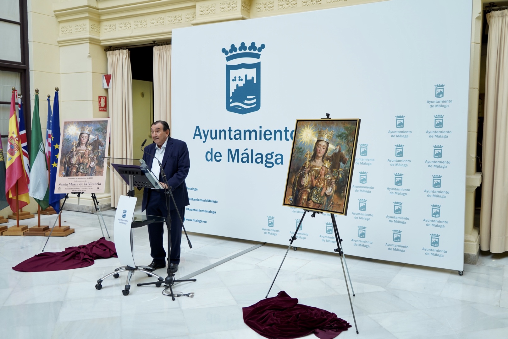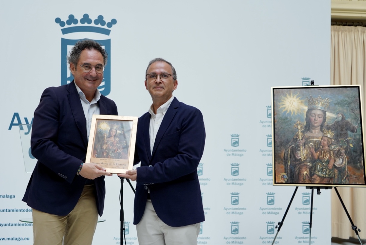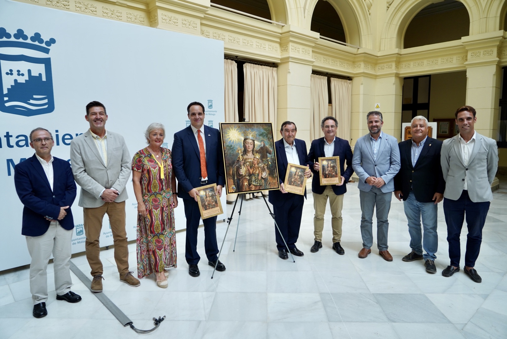 El concejal delegado del distrito Centro, Francisco Cantos; la concejala delegada de Servicios Operativos, Playas y Fiestas, Teresa Porras; y más miembros de la Corporación Municipal, junto al hermano mayor de la Real Hermandad de Santa María de la Victoria, Miguel Orellana, han asistido a la presentación del cartel de la procesión de Santa María de la Victoria de este año, obra de Raúl Berzosa, que ha tenido lugar en el Patio de Banderas del Ayuntamiento.