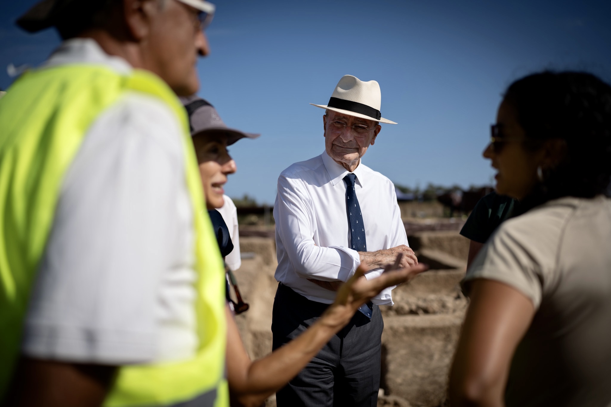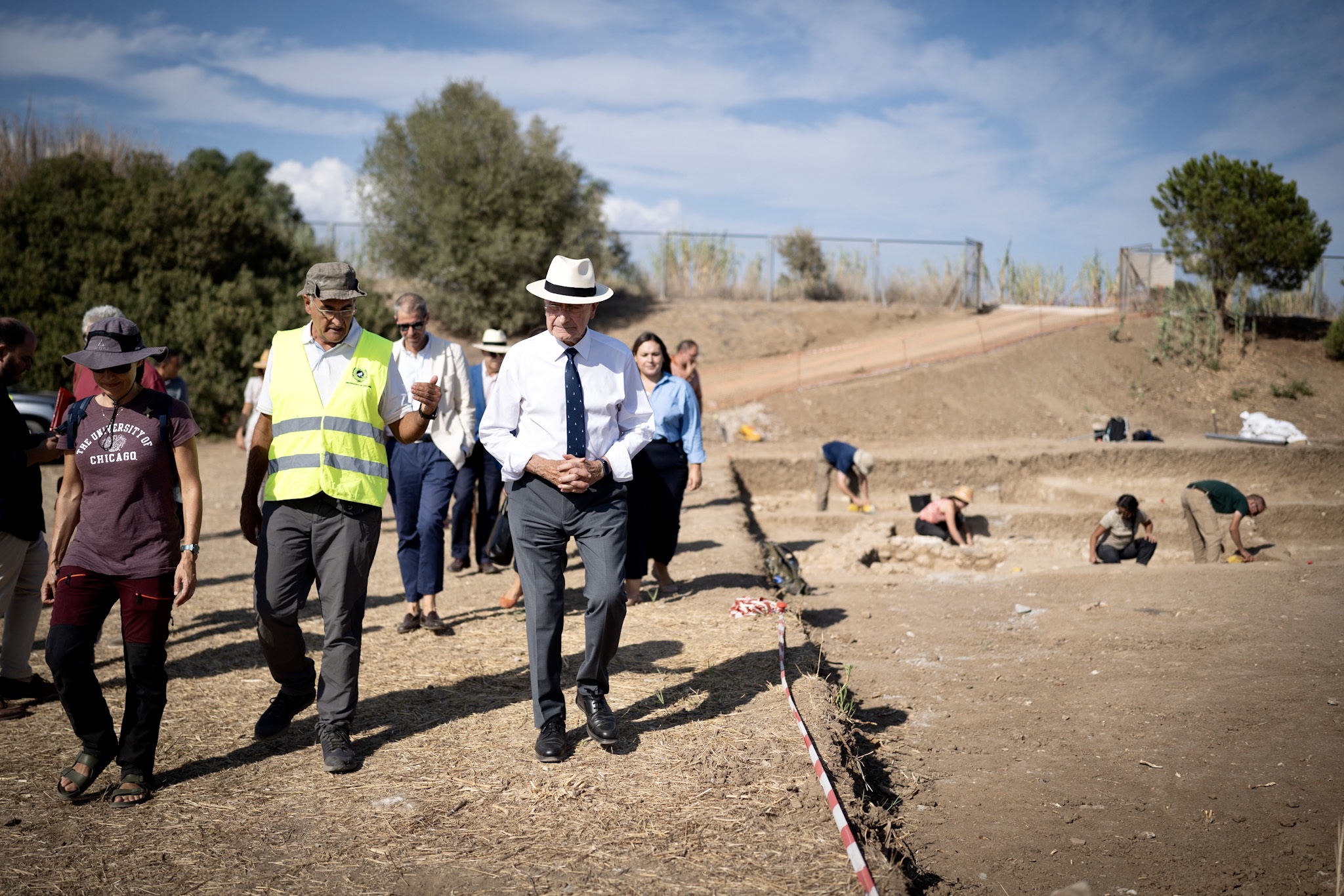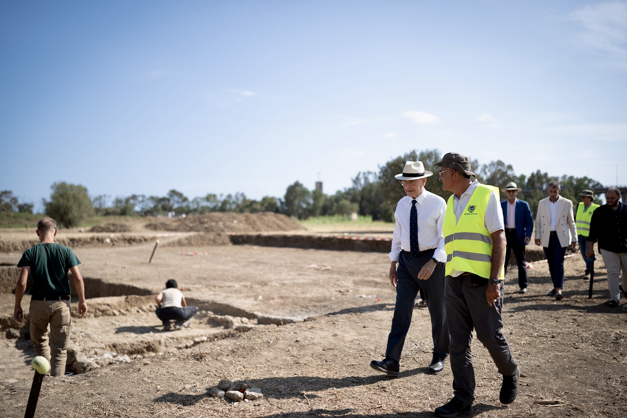 El alcalde de Málaga, Francisco de la Torre, ha visitado esta tarde la actividad arqueológica que se está llevando a cabo en el yacimiento fenicio del Cerro del Villar. Estos trabajos, que cuentan con la colaboración del Consistorio, la Universidad de Málaga y la Fundación Málaga, están dirigidos por el arqueólogo y profesor del departamento de Ciencias Históricas de la UMA José Suárez. Junto a De la Torre han acudido a la visita las concejalas de Cultura y Urbanismo, Mariana Pineda y Carmen Casero; la concejala del distrito de Churriana, Mercedes Martín; la vicerrectora adjunta de Innovación de la Universidad de Málaga, María Zaida Díaz, y el presidente de la Fundación Málaga, Juan Cobalea.
