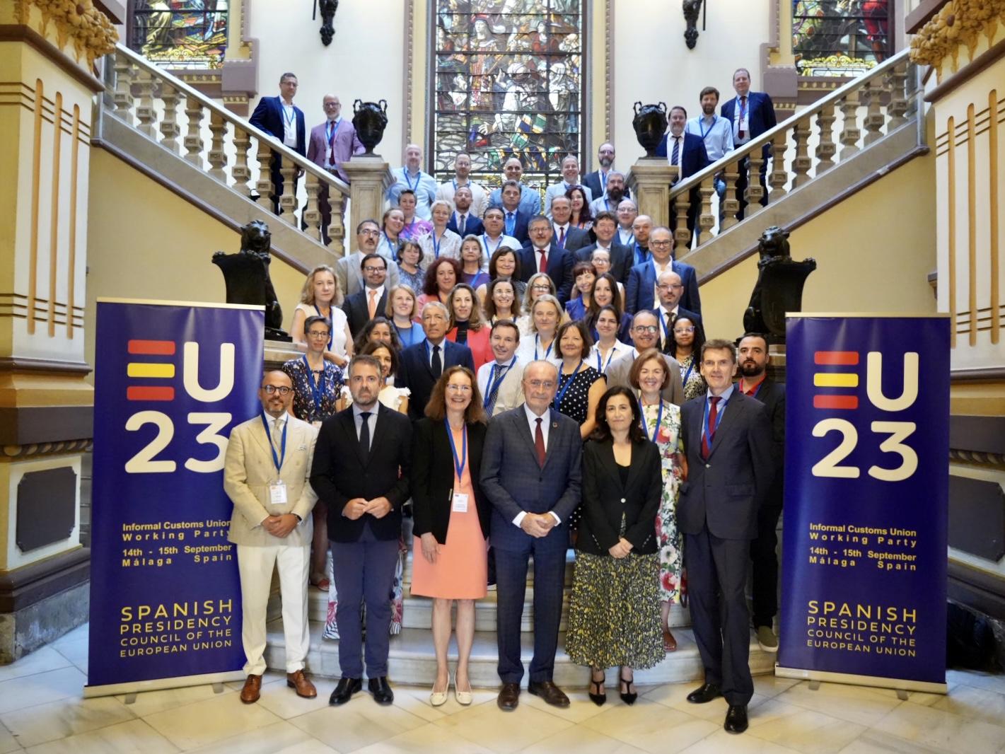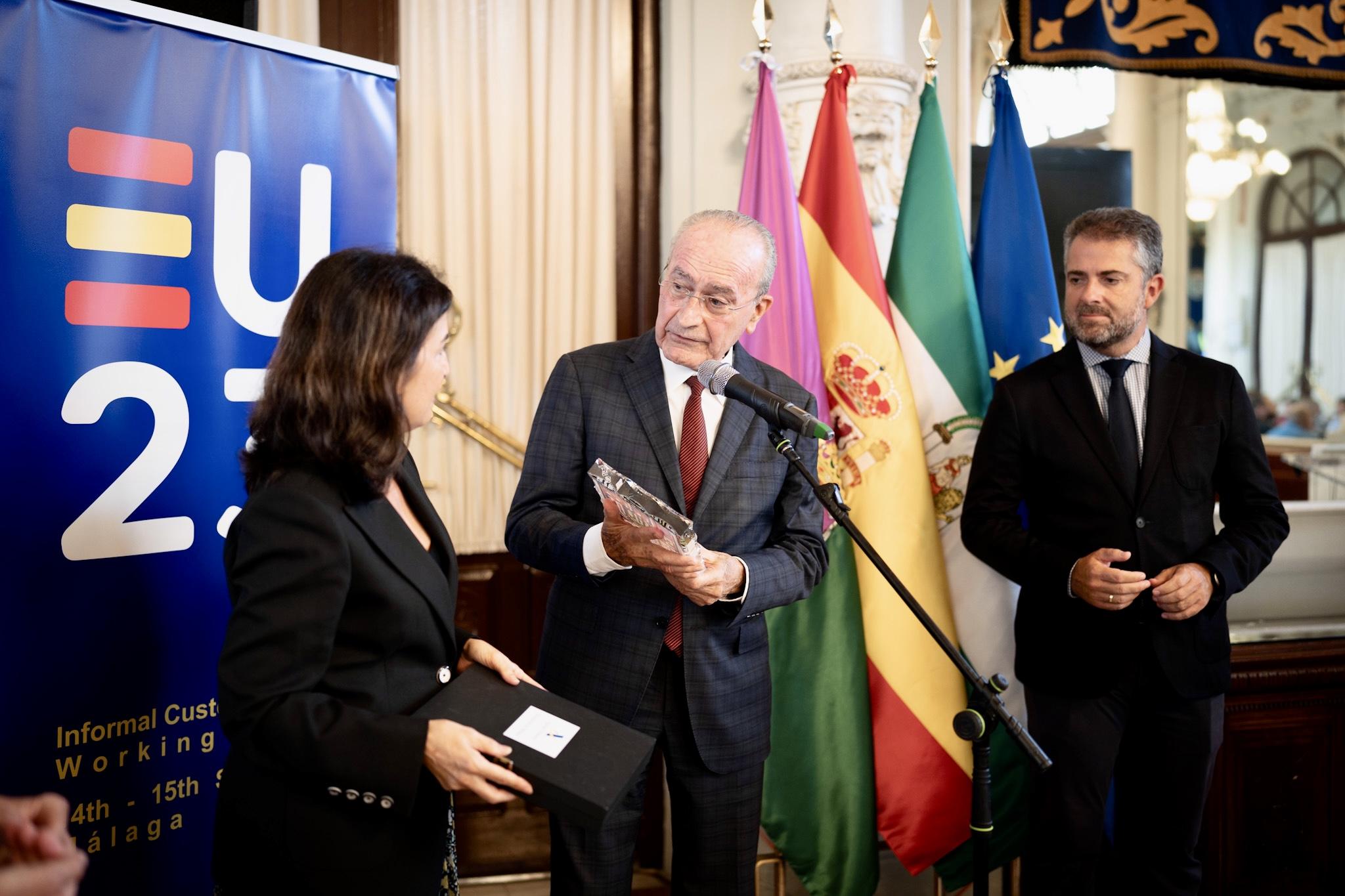 El alcalde de Málaga, Francisco de la Torre, junto al concejal delegado de Economía, Hacienda y Fondos de la UE, Carlos Conde, ha recibido en el Ayuntamiento a los participantes en este encuentro informal. Se han dado cita hoy en Málaga alrededor de 60 expertos en materia aduanera de los 27 estados miembros que componen la Unión Europea, entre los que se encuentran la jefa de la Unidad de Política Aduanera de la Comisión Europea, Michelle Perolat; el director de Aduanas de la Comisión Europea, Matthias Petschke; el consejero de Finanzas y representante permanente de España ante la UE, Javier Campillo; y la delegada de la Agencia Estatal de Administración Tributaria de Málaga María Dolores Villalón.