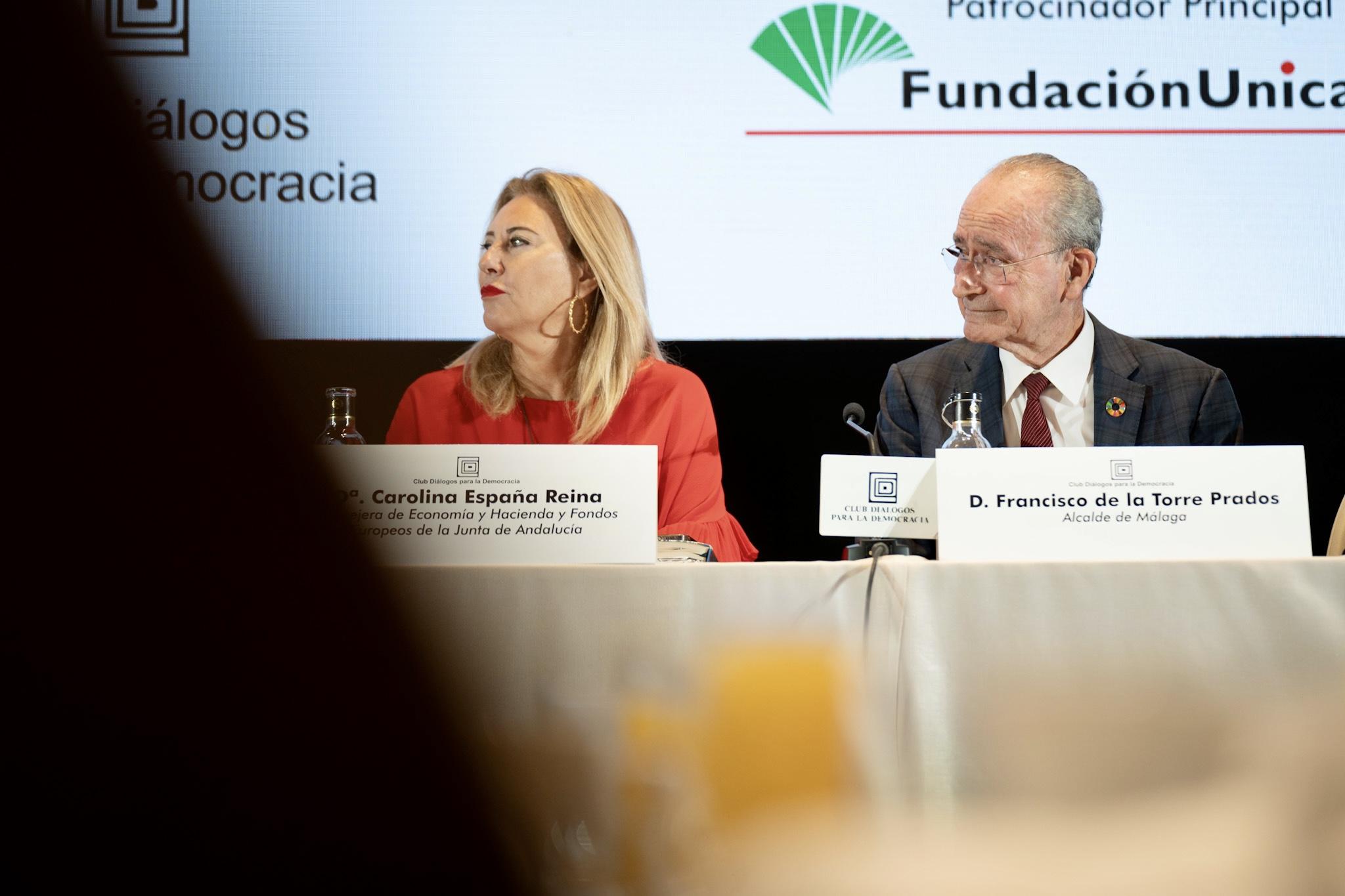 También han asistido el presidente del Club, Diálogos para la Democracia, Antonio Gavilanes; el presidente de la Fundación Bancaria Unicaja, José Manuel Domínguez; el presidente de ARCS Estudios y Servicios Técnicos, José Pedro Alba; el presidente ejecutivo de Sando, Luis Sánchez; y la consejera de Economía, Hacienda y Fondos Europeos, Carolina España.