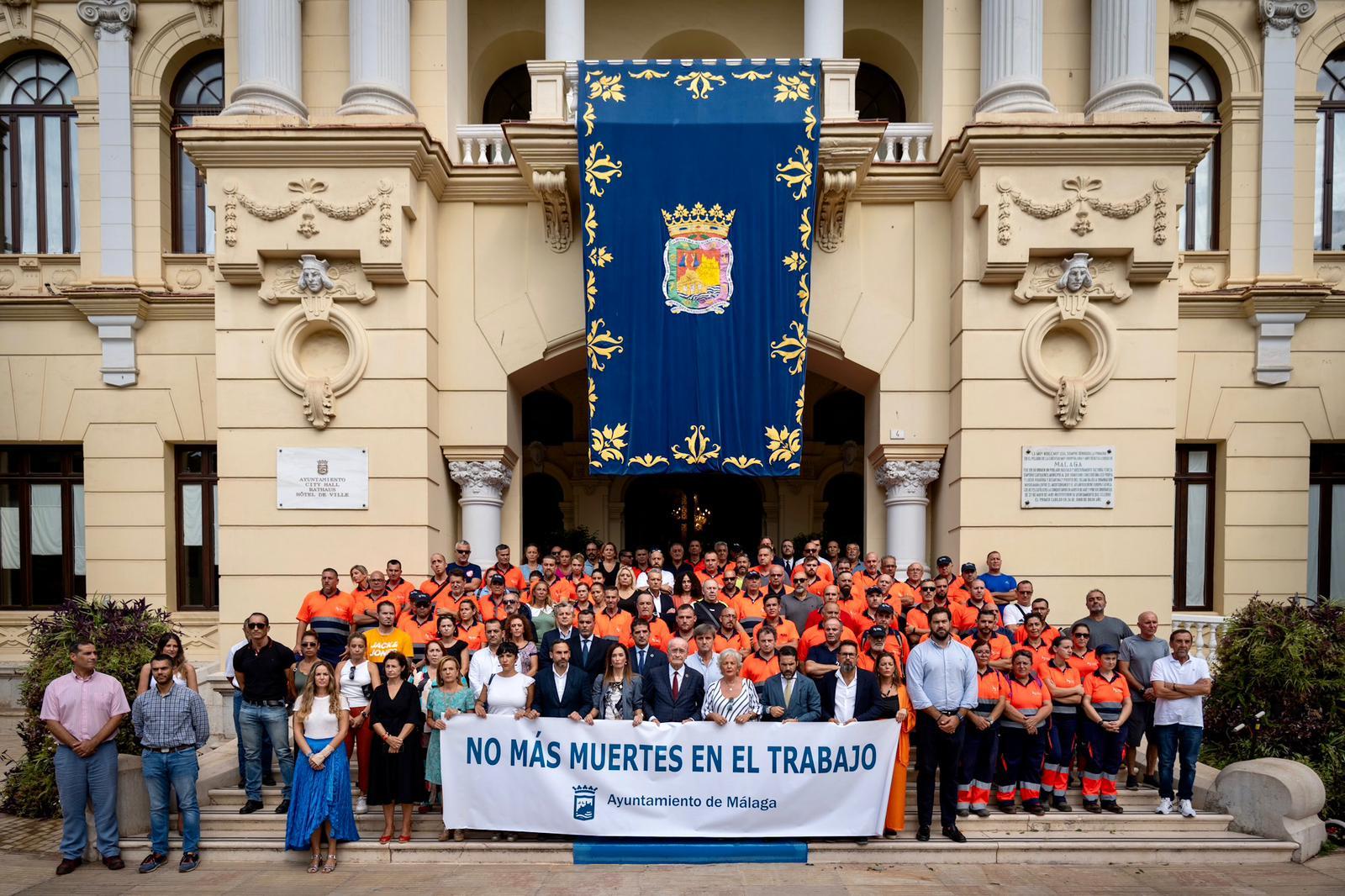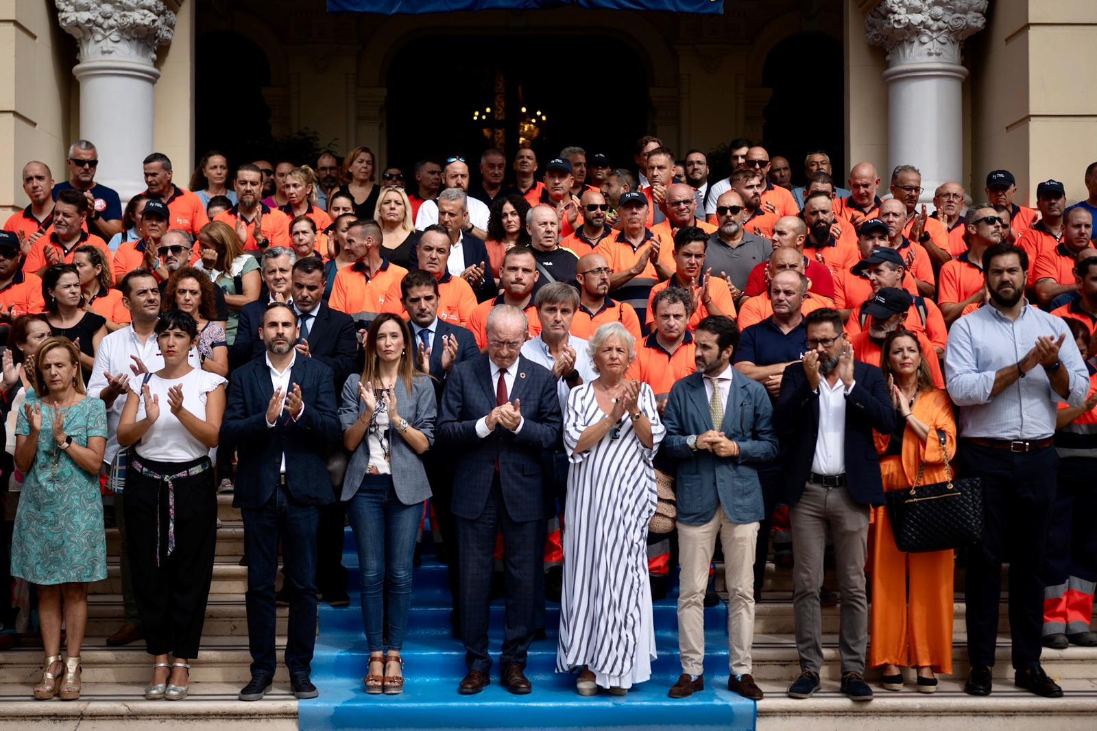 El alcalde de Málaga, Francisco de la Torre, junto a la Corporación Municipal, ha mantenido en la puerta del Ayuntamiento un minuto de silencio en memoria de la trabajadora de la empresa municipal Limasam Victoria Ayala Vallejo, fallecida ayer tras sufrir un accidente laboral en Los Ruices el pasado lunes.