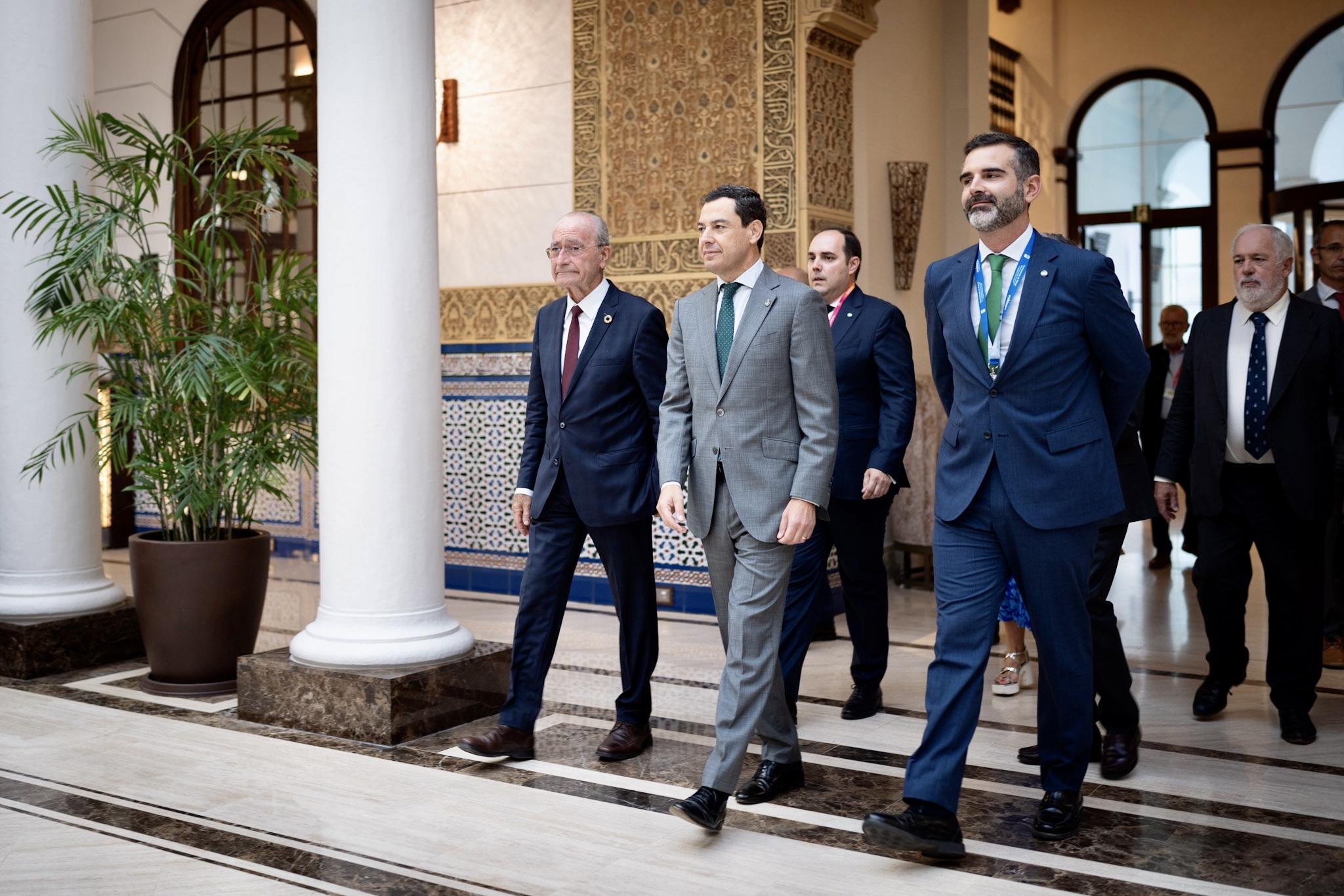 El alcalde de Málaga, Francisco de la Torre, junto al presidente de la Junta de Andalucía, Juan Manuel Moreno, y al ex comisario de Acción por el Clima y Energía de la Unión Europea, Miguel Arias Cañete, ha participado en la apertura de la segunda jornada de la Comisión de Medio Ambiente (ENVE) del Comité de Regiones de la Unión Europea, que se celebra bajo el título ‘Hacia un pacto verde mundial’ en el Gran Hotel Miramar.