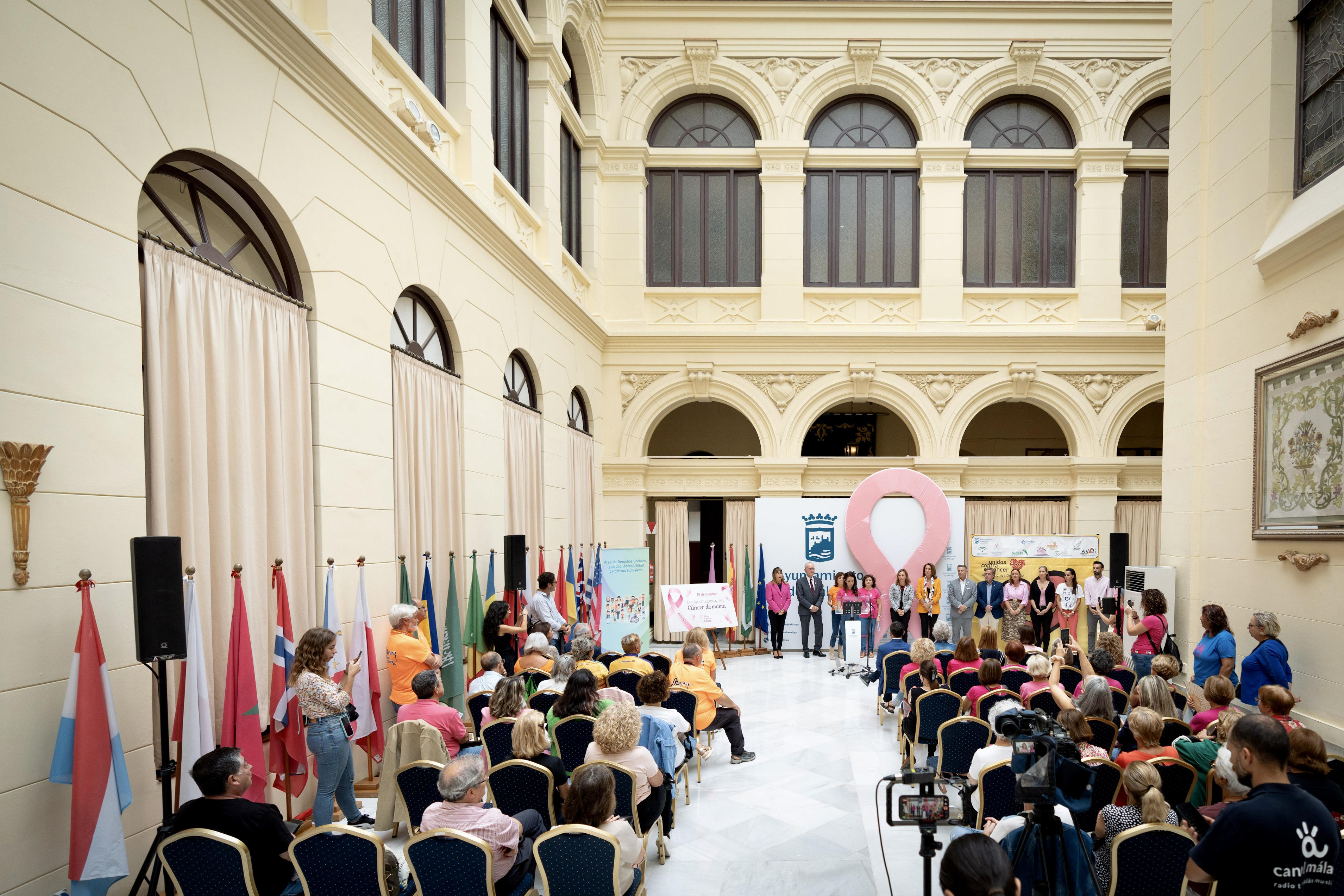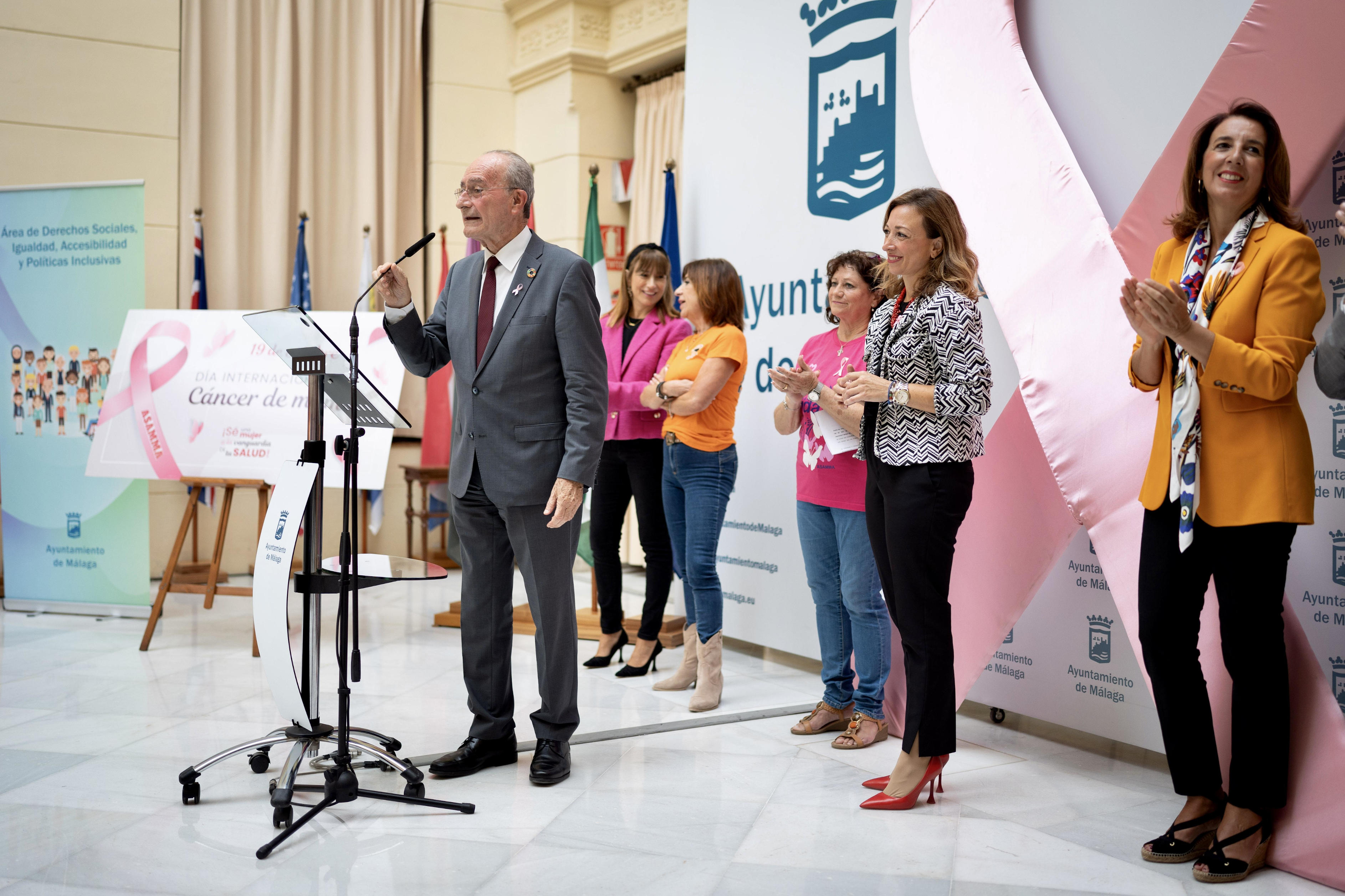 El alcalde de Málaga, Francisco de la Torre, junto a la delegada del Gobierno de la Junta de Andalucía en Málaga, Patricia Navarro, y otros ediles de la Corporación, ha asistido hoy a la lectura del manifiesto con motivo del Día Internacional de la lucha contra el Cáncer de Mama, organizado por la Agrupación de Desarrollo Unidos Contra el Cáncer, de la forma parte el Ayuntamiento a través del Área de Derechos Sociales. Además, esta entidad también la componen ASAMMA, Fundación Ronald McDonald, AVOI, FMAEC, CUDECA, AECC, Cesare Scariolo y Fundación Andrés Olivares y ASPANOMA. El acto se ha celebrado en el Patio de Banderas del Ayuntamiento.