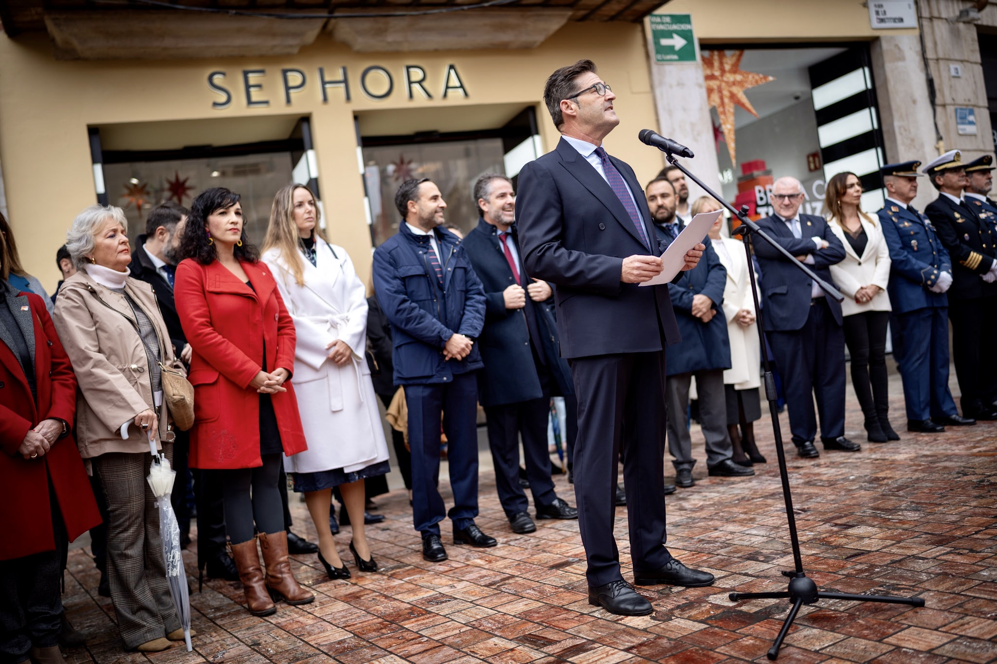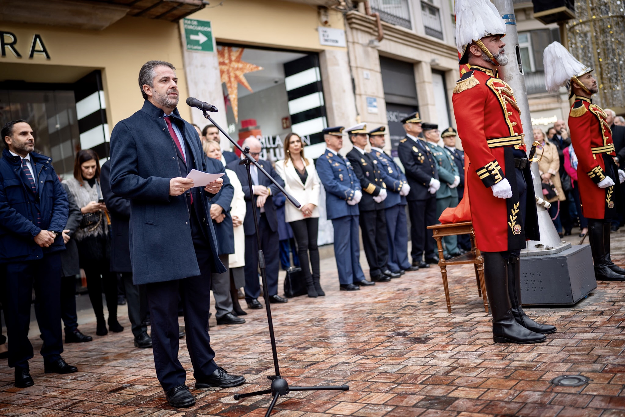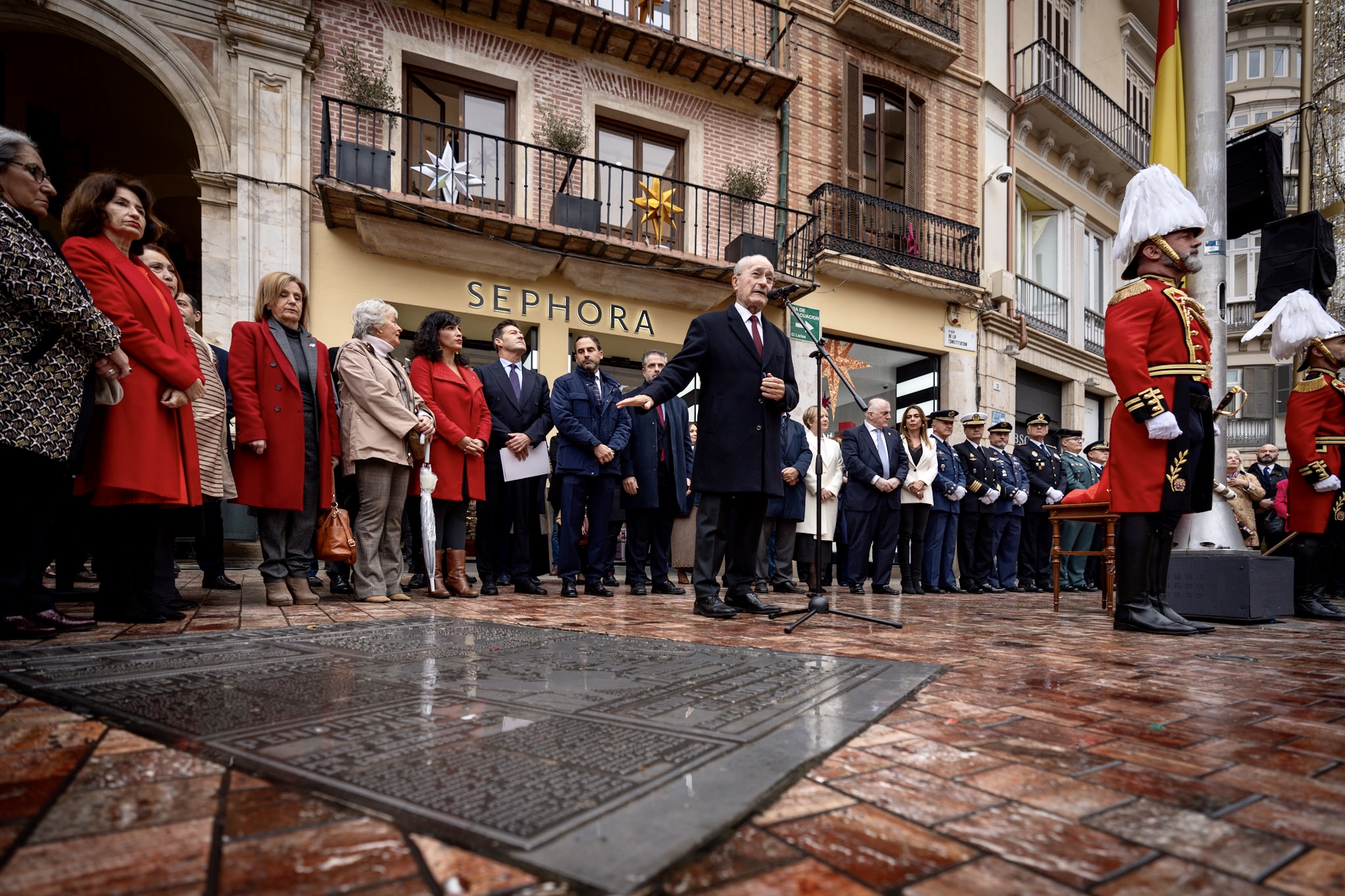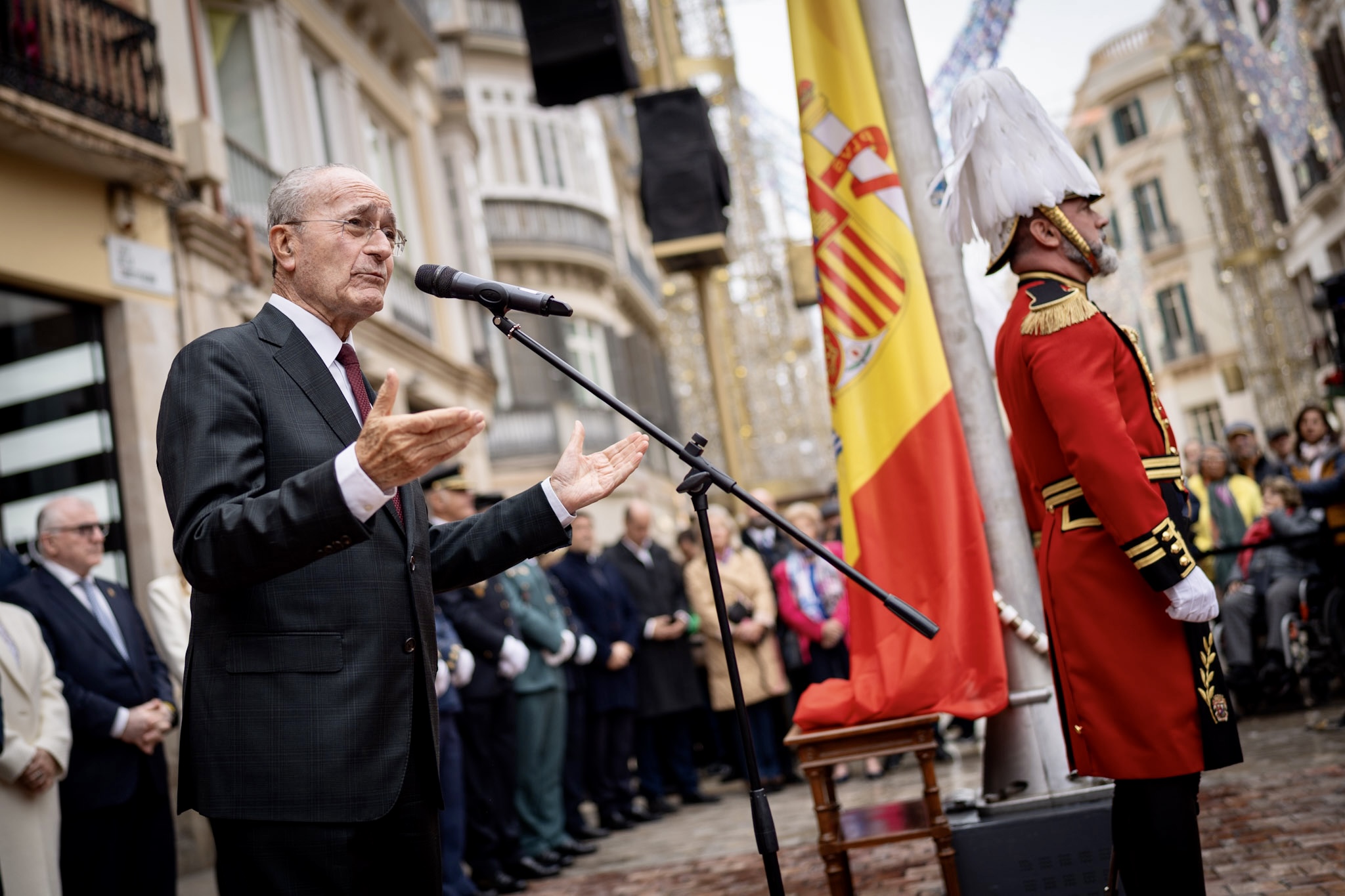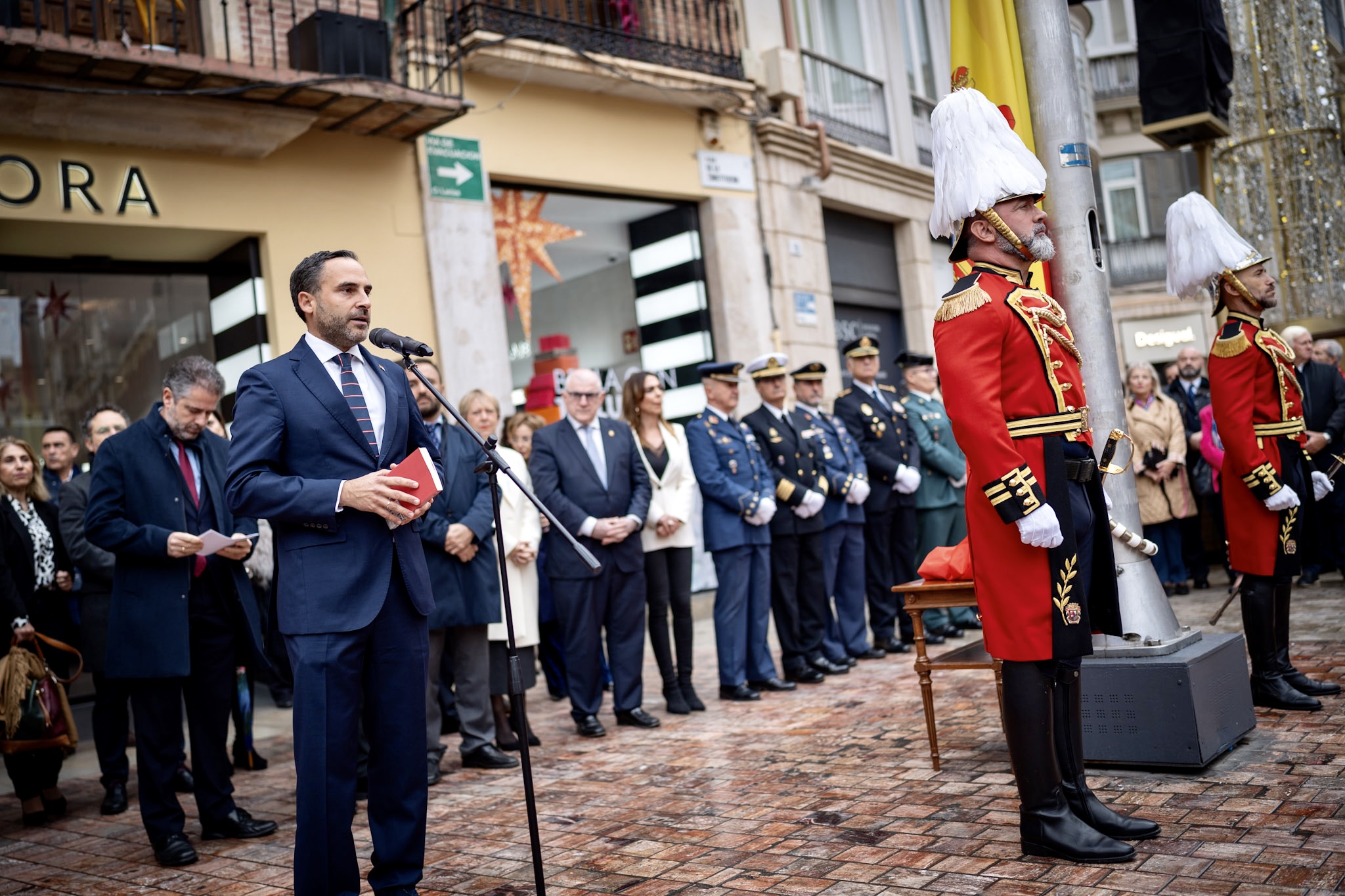 El alcalde de Málaga, Francisco de la Torre, junto a más ediles de la Corporación, ha participado en el acto municipal con motivo del Día de la Constitución Española, que se ha celebrado en la plaza de la Constitución. Tras las intervenciones de los portavoces de los cuatro grupos municipales (PP, PSOE, Vox y Con Málaga), ha tomado la palabra el alcalde, que ha cerrado el acto con el izado de la bandera de España durante la interpretación del Himno Nacional por parte de la Banda Municipal.