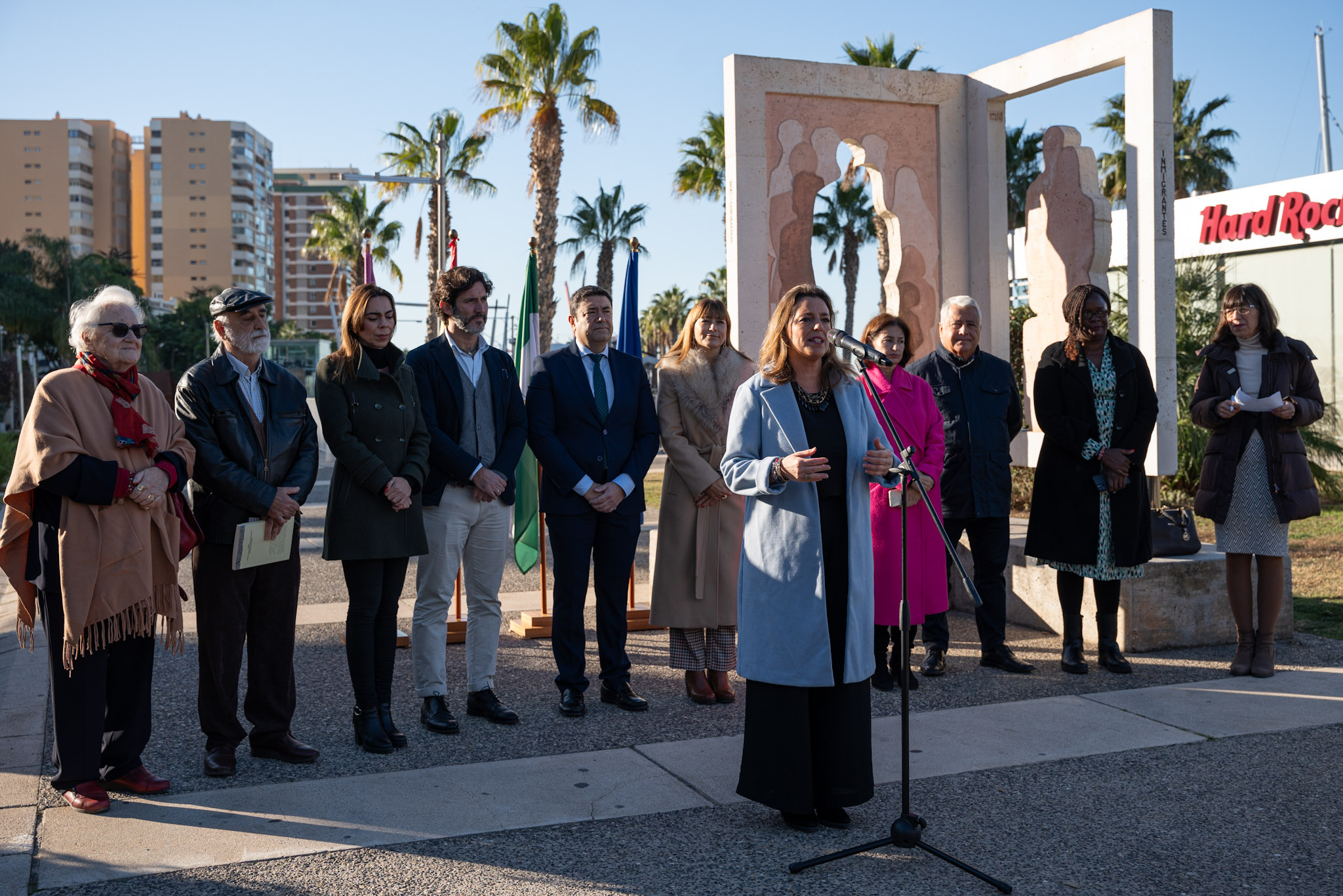 El Ayuntamiento de Málaga se suma a la conmemoración del Día Internacional del Migrante, que se celebra cada 18 de diciembre, con un homenaje en la escultura ‘Los Migrantes’ situada en el Muelle Uno. Al acto institucional ha asistido la concejala delegada de Participación, Migración y Cooperación al Desarrollo, Mar Torres, junto a otros ediles de la Corporación, acompañada por la delegada territorial de Inclusión Social de la Junta de Andalucía, Ruth Sarabia; el diputado de Tercer Sector y Cooperación Internacional, Francisco José Martín; y el decano del cuerpo consular de Málaga, Alberto Benito. Con motivo del décimo aniversario de la inauguración de la escultura ‘Los Migrantes’ también ha estado presente su autor, Andrés Montesanto, migrante residente en Málaga desde 1989. El monumento ‘Los Migrantes’, financiado por el Ayuntamiento de Málaga, está dedicado a los inmigrantes y emigrados de Málaga, a todos los ciudadanos del mundo que eligieron venir a vivir a esta ciudad, y a todos los malagueños que, por distintas razones, tuvieron que dejarla.