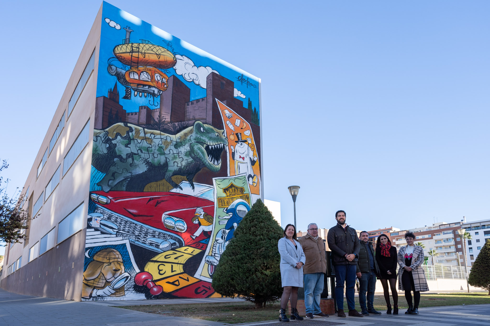 El concejal delegado del distrito Teatinos-Universidad, Borja Vivas, ha inaugurado esta mañana el mural realizado en la fachada del CEIP Almudena Grandes en homenaje al ilustrador e historietista Isidre Monés. Al acto también ha asistido el artista urbano que ha ejecutado el proyecto, Alex León, de la empresa ‘La máquina imaginaria’, así como el director del colegio, José Jesús Chito.