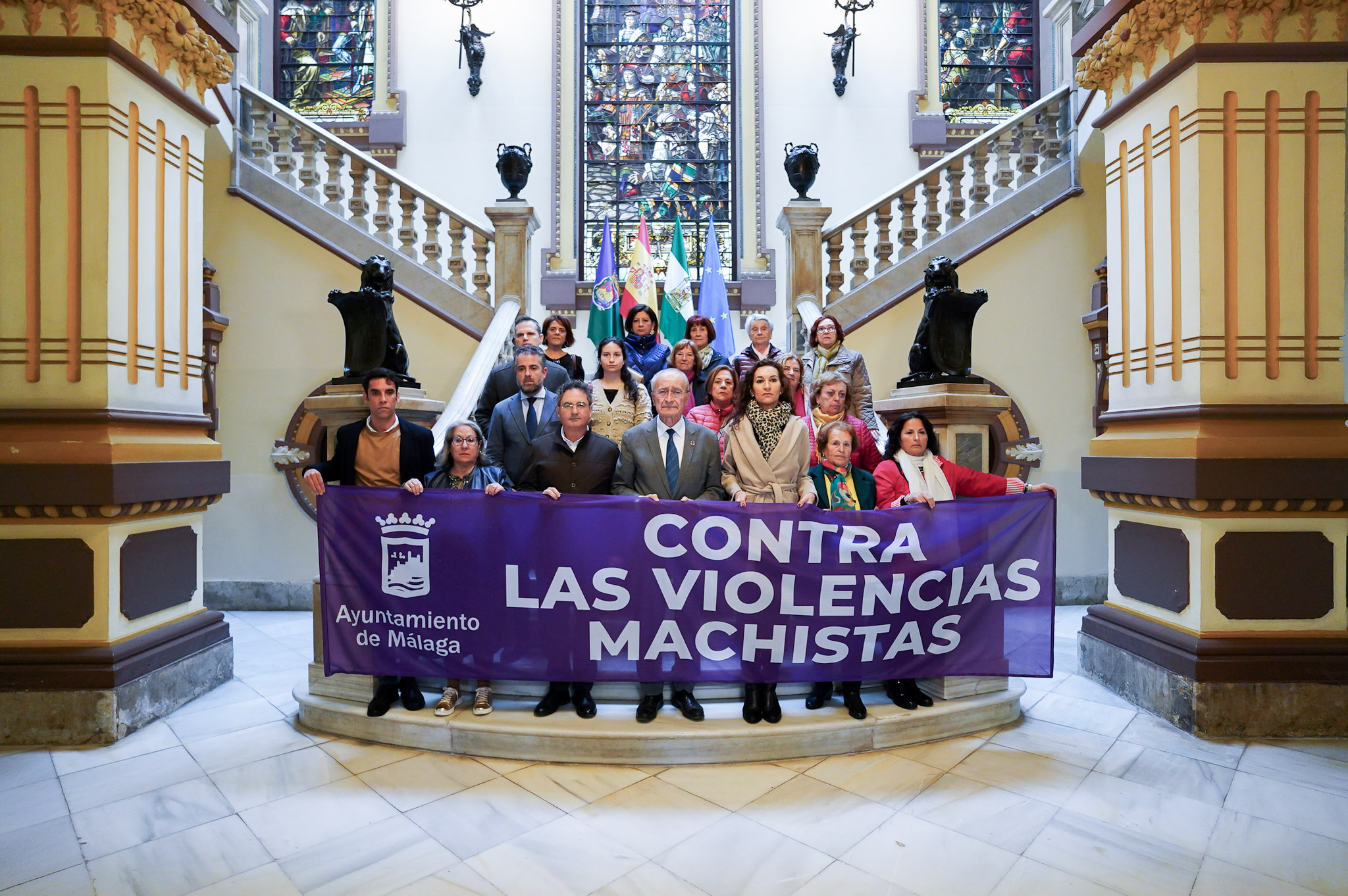 El alcalde de Málaga, Francisco de la Torre, junto a otros ediles de la Corporación Municipal ha mantenido un minuto de silencio en memoria de la última víctima de la violencia machista confirmada: una mujer asesinada en la provincia de Alicante. Ha sido este mediodía en las escaleras interiores del edificio del Ayuntamiento.