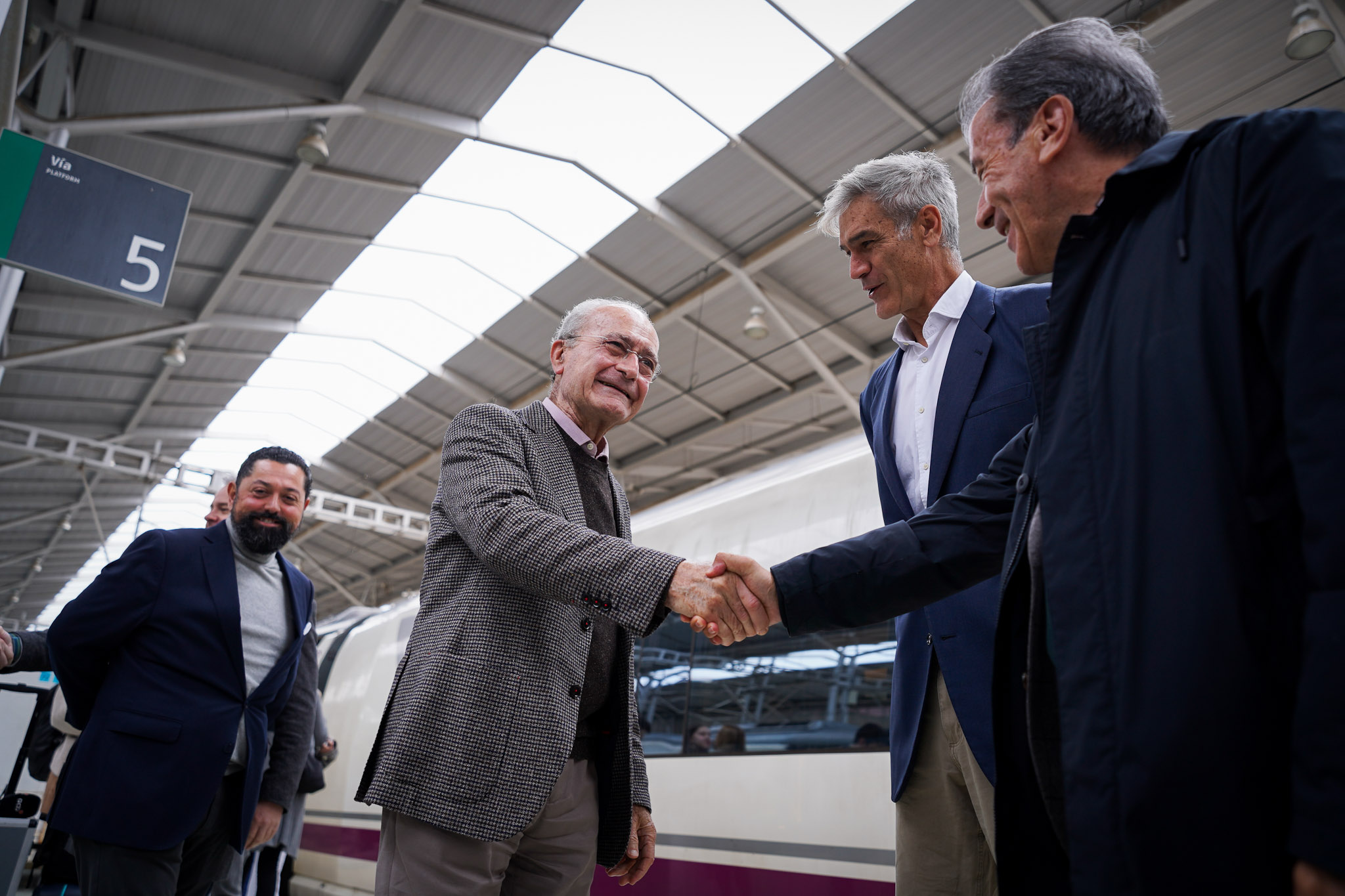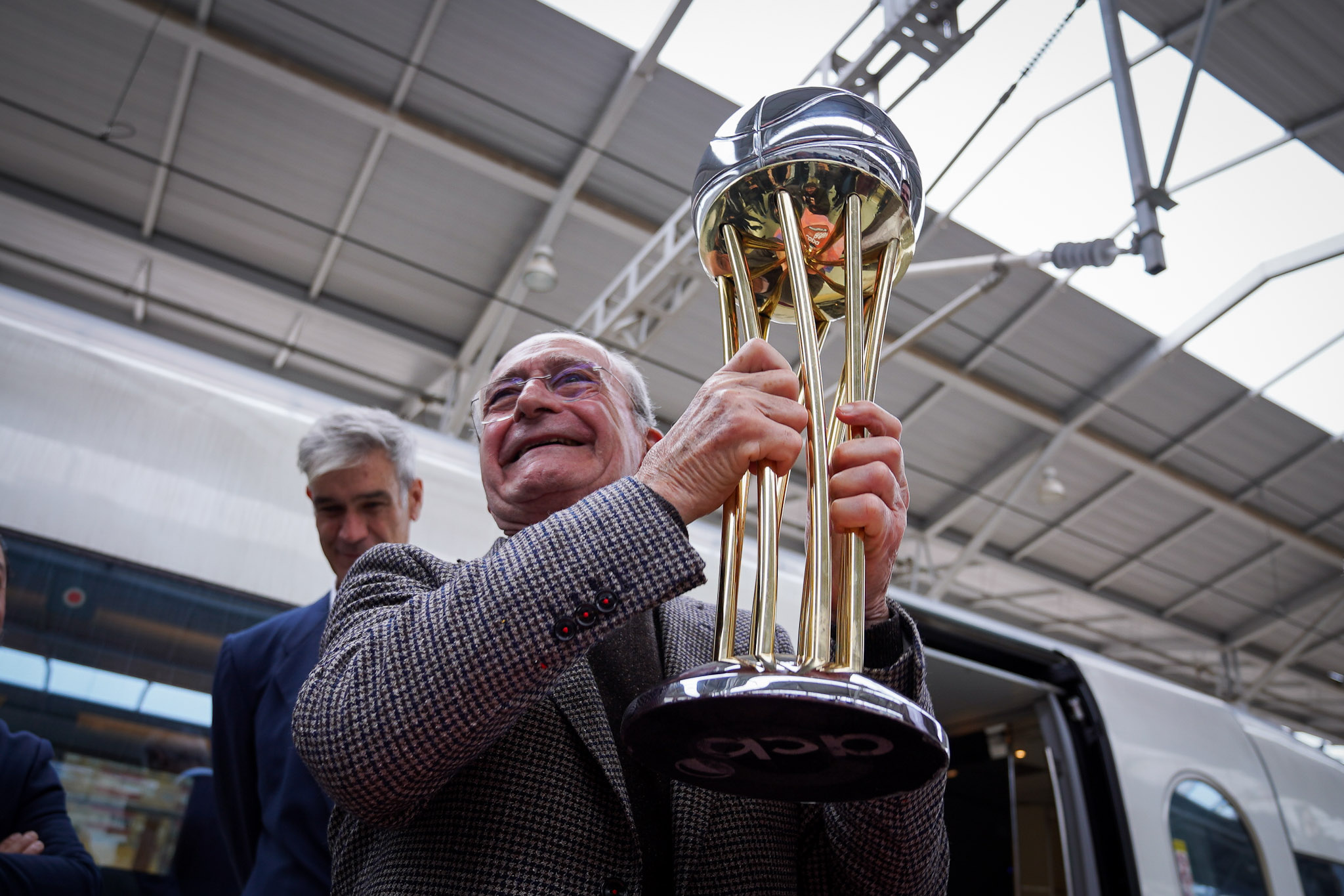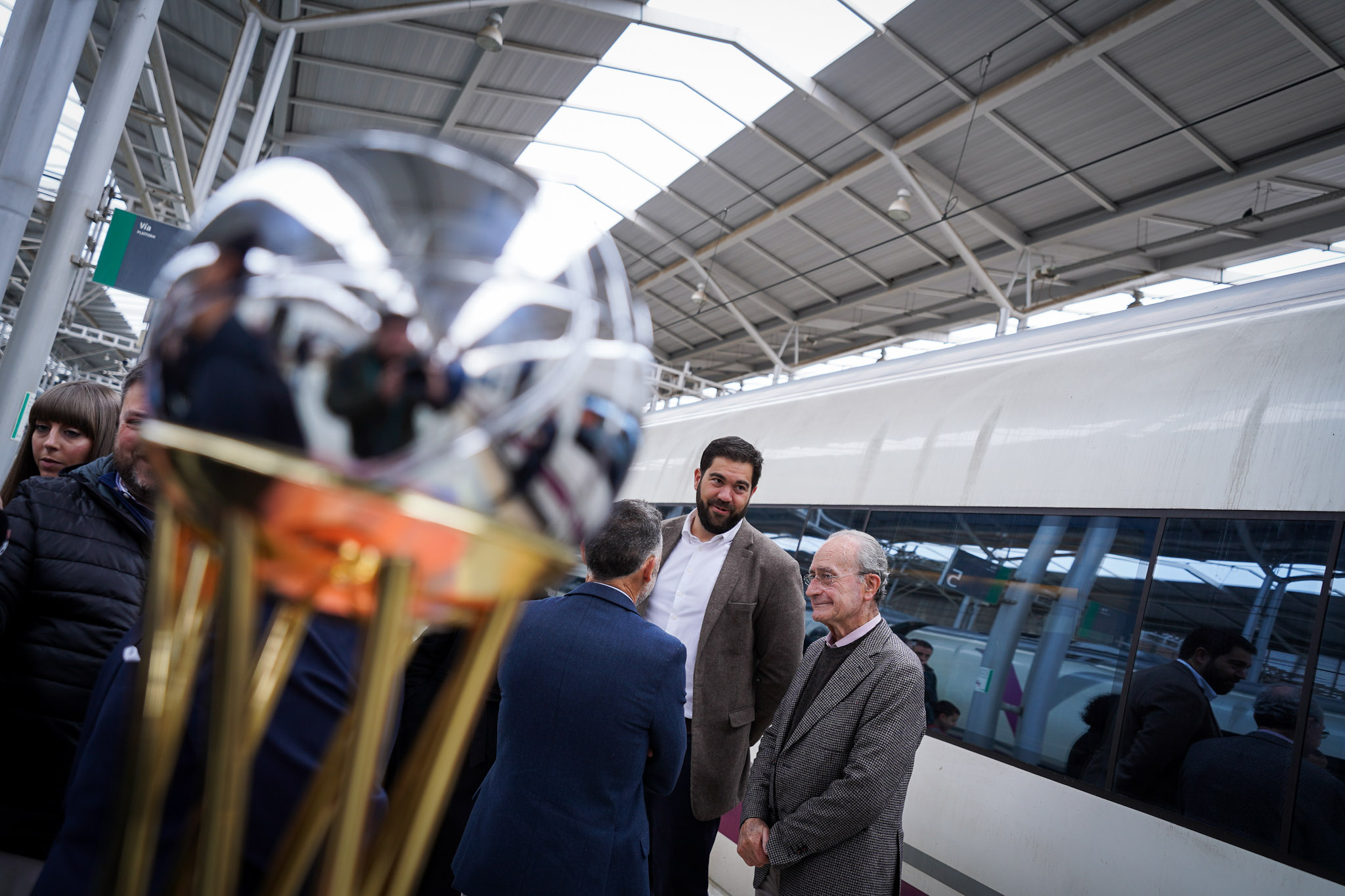 El alcalde de Málaga, Francisco de la Torre, junto al concejal delegado de Deporte, Borja Vivas; el presidente de la ACB, Antonio Martín; el secretario general de deporte de la Junta de Andalucía, José María Arrabal, y el vicepresidente de la Diputación de Málaga, Juan Rosas, ha recibido hoy en la Estación María Zambrano el trofeo de la Copa del Rey, que se disputará entre el 15 y el 18 de febrero en el Palacio de Deporte José María Martín Carpena.